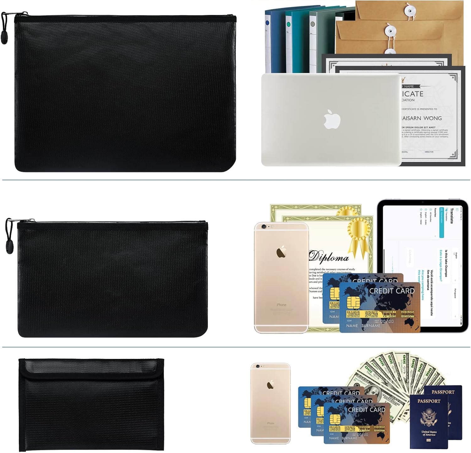 - [Unterschiedlicher Kapazität] 2 feuerfeste dokumententasche mit Reissverschluss, 1 kleine feuerfeste geldtasche mit Klettverschluss. Es kann nicht nur Tablet und A4-Dateien aufnehmen, sondern kann auch als Brieftasche verwendet werden, um kleine