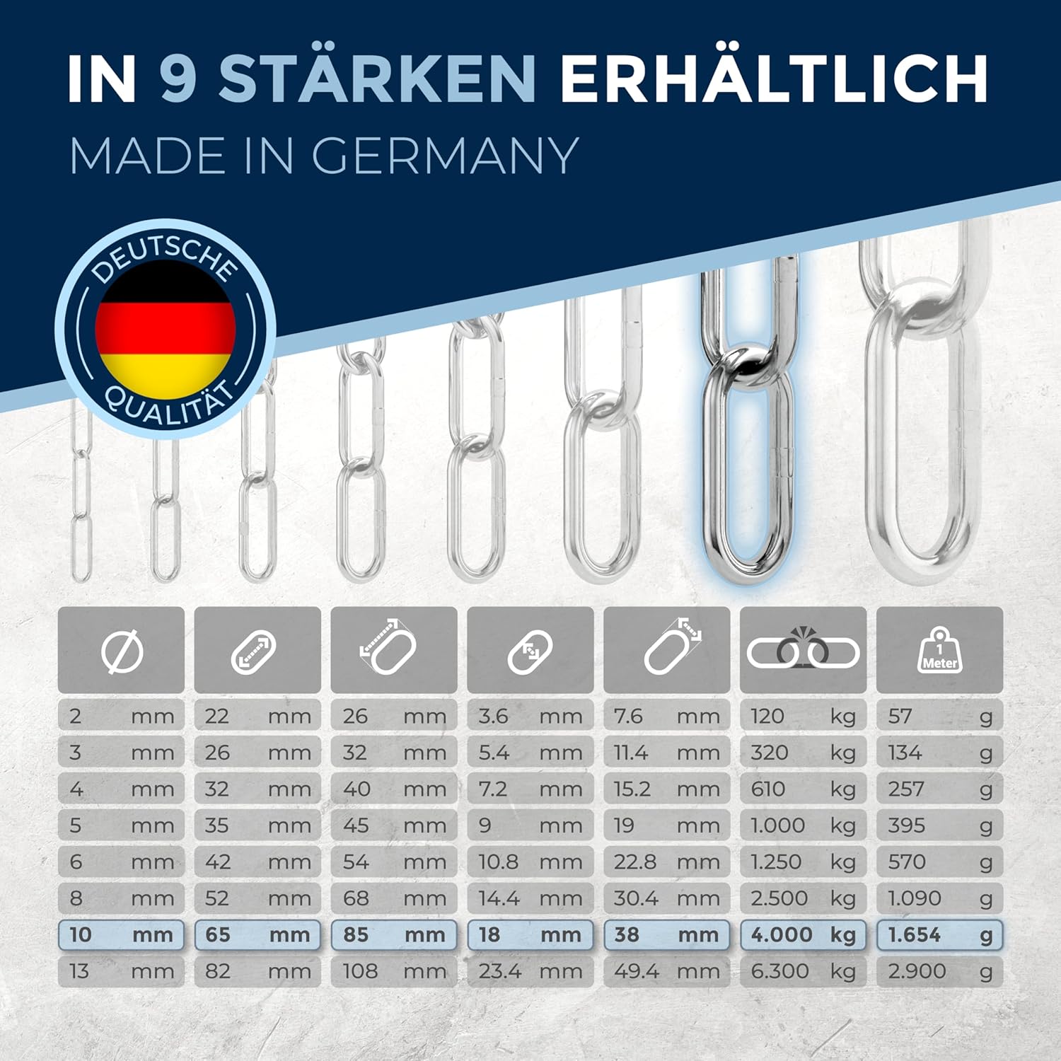 - Drahtstärke: 10 mm | Kettenglieder Länge Aussen: 85 mm | Kettenglieder Länge Innen: 65 mm | Kettenglied Breite Aussen: 38 mm | Kettenglied Breite Innen: 18 mm | Bruchlast: 4.000 kg | Gewicht pro Meter Kette Edelstahl Meterware: 1.654 g/Meter