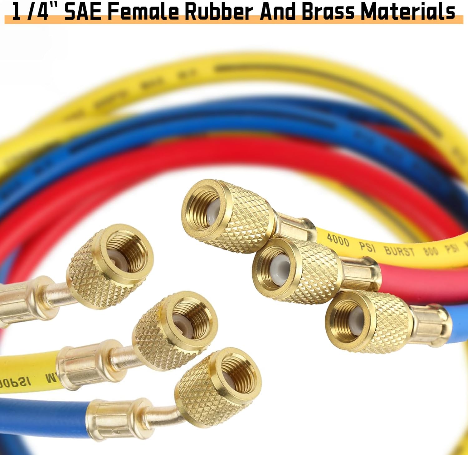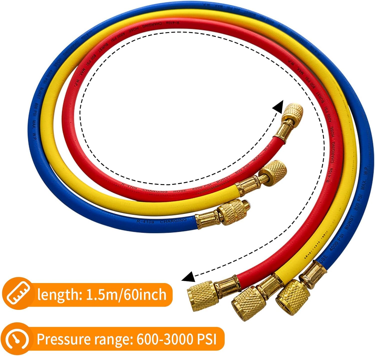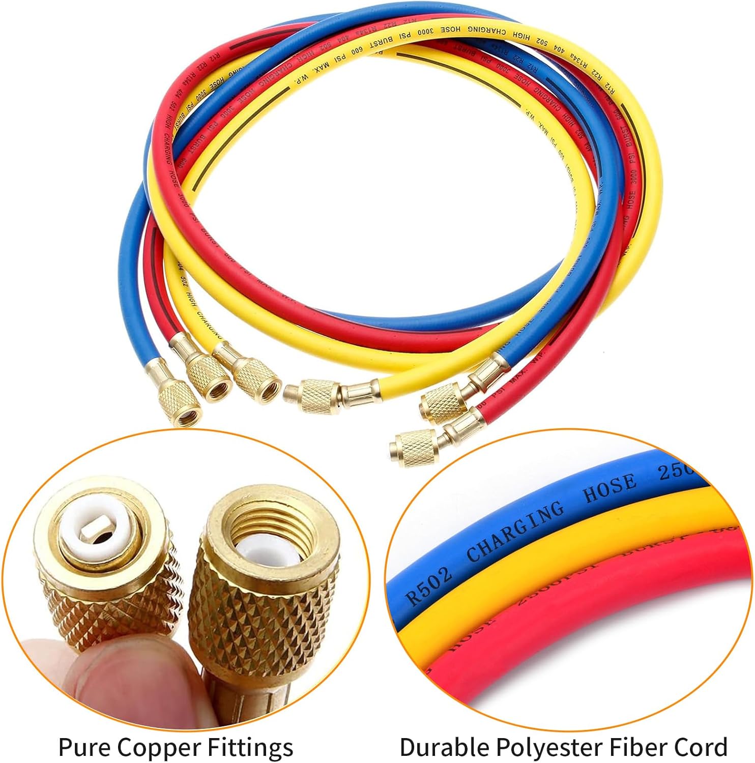 - 【Produktinformationen】Drei Farben: Rot, Gelb, Blau; Länge: 1.5m/60 Zoll; Anwendbare Modelle: R134a; Anschlussgewindegrösse: 1/4 SAE; Druckbereich :600 PSI-3000 PSI; Packliste: 3 Klimaanlagen-Fluoridschläuche.Der Kältemittelfüllschlauch ist ein