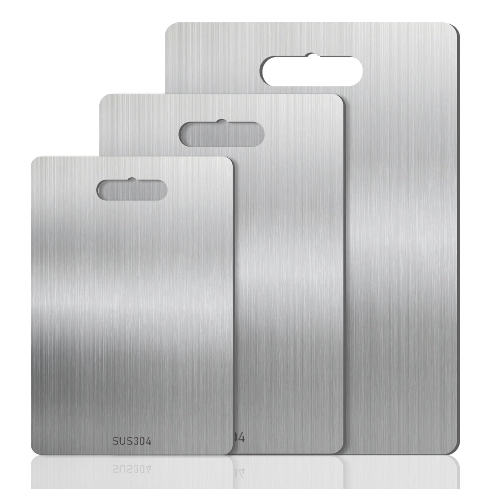 - Mehrere Grössen:Schneidebrett aus Edelstahl ist in verschiedenen Grössen erhältlich, um Ihren unterschiedlichen Kochanforderungen gerecht zu werden. Geniessen Sie saubere Arbeitsplatten und eine elegante Atmosphäre in Ihrem Kochbereich.