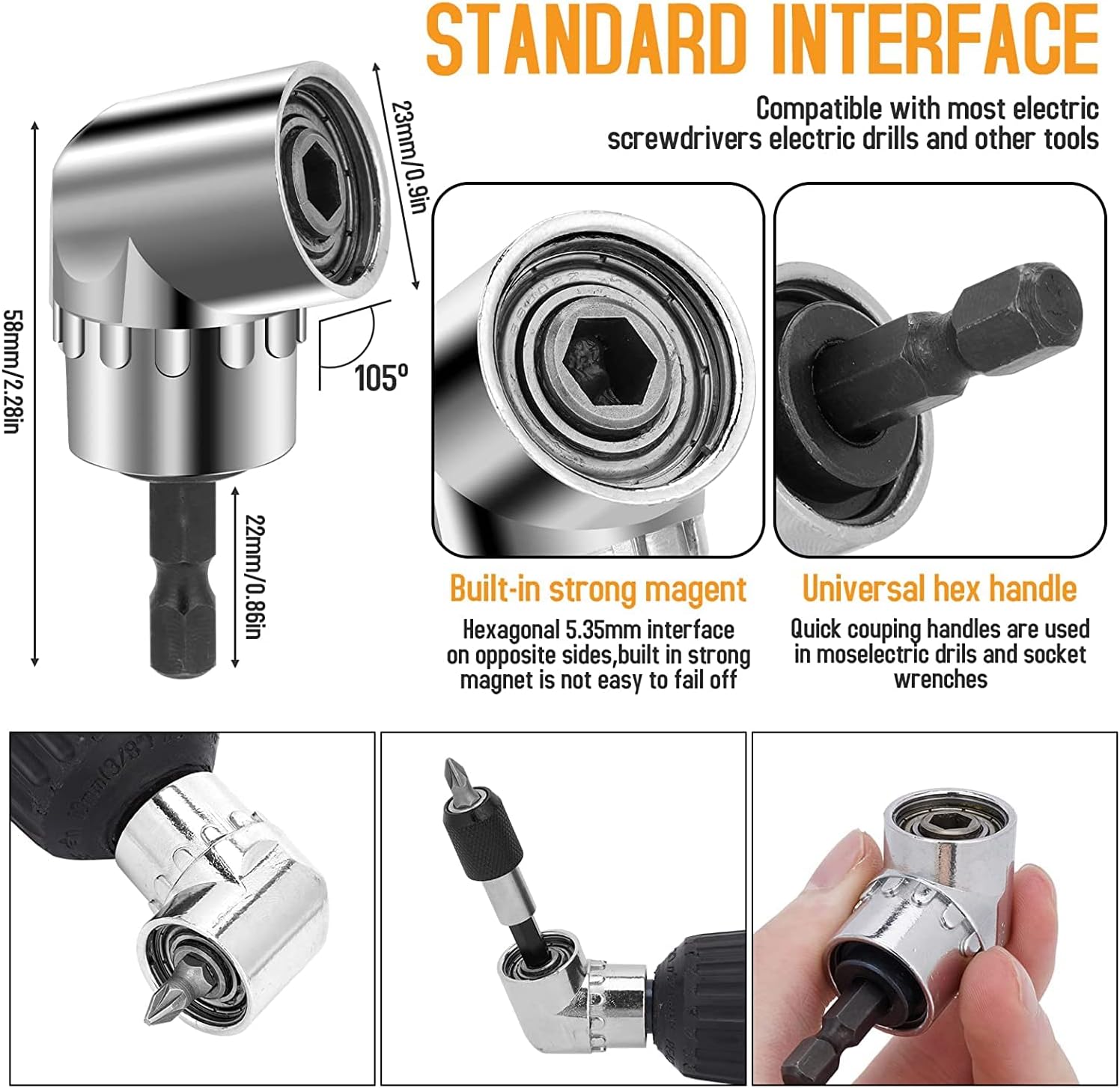 - ✑ 105° rechtwinkliger Bohrer und Sockelschlüssel: Verwenden Sie, in dem Sie verwenden, wenn Sie schwierige Stellen haben, um zu gelangen, können Sie einen Bohrer, wiederaufladbaren Bohrer oder manuellen Schraubenschlüssel anschliessen, um ihn auf