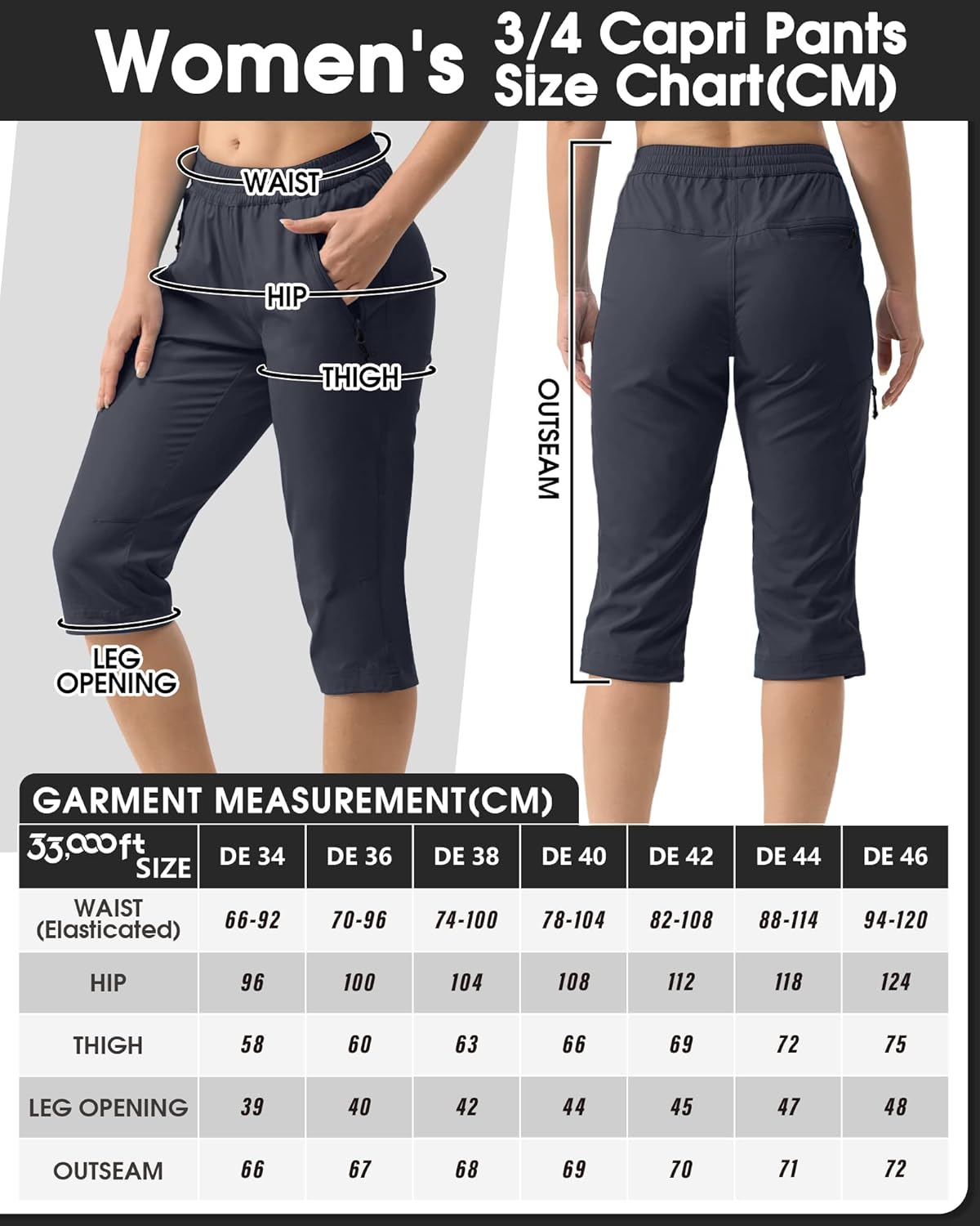 - LEICHTGEWICHT und SCHNELL TROCKNEND: 3/4 Wanderhose damen besteht aus 90% Polyester 10% Spandex. Sie besteht aus leichtem, feuchtigkeitsableitendem, weichem High-Tech-Gewebe, das Sie den ganzen Tag über trocken und komfortabel hält. 3/4 Capri-Hose für