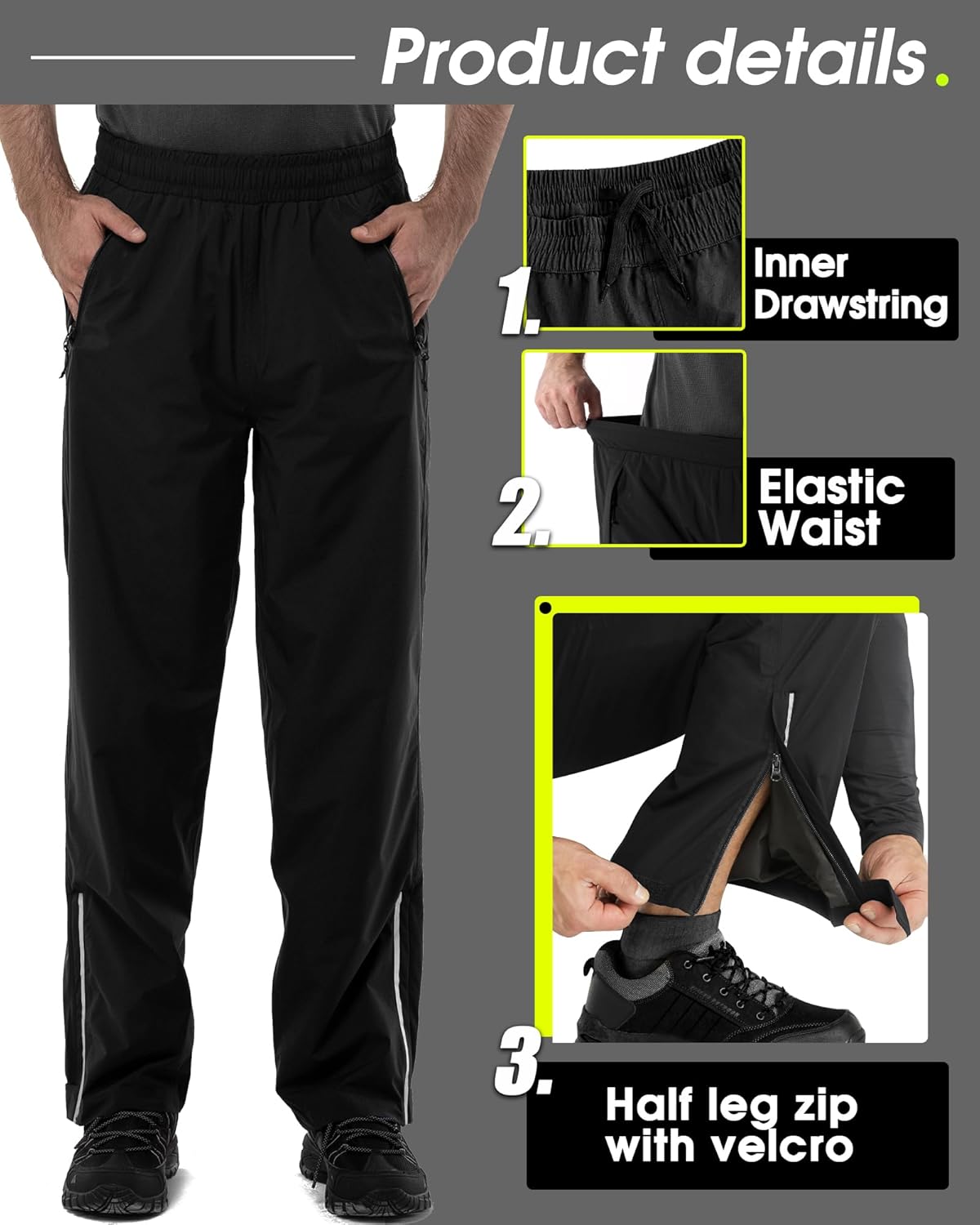 - HUMANIZED DESIGN: 33,000ft wasserdichte regenhose für herren ist voll elastischen Bund mit Kordelzug innen, es hilft Ihnen, Ihre Passform um die Taille anpassen. Die 3 Reissverschlusstaschen mit Flip, bietet grosse Privatsphäre und Komfort für Sie. Es