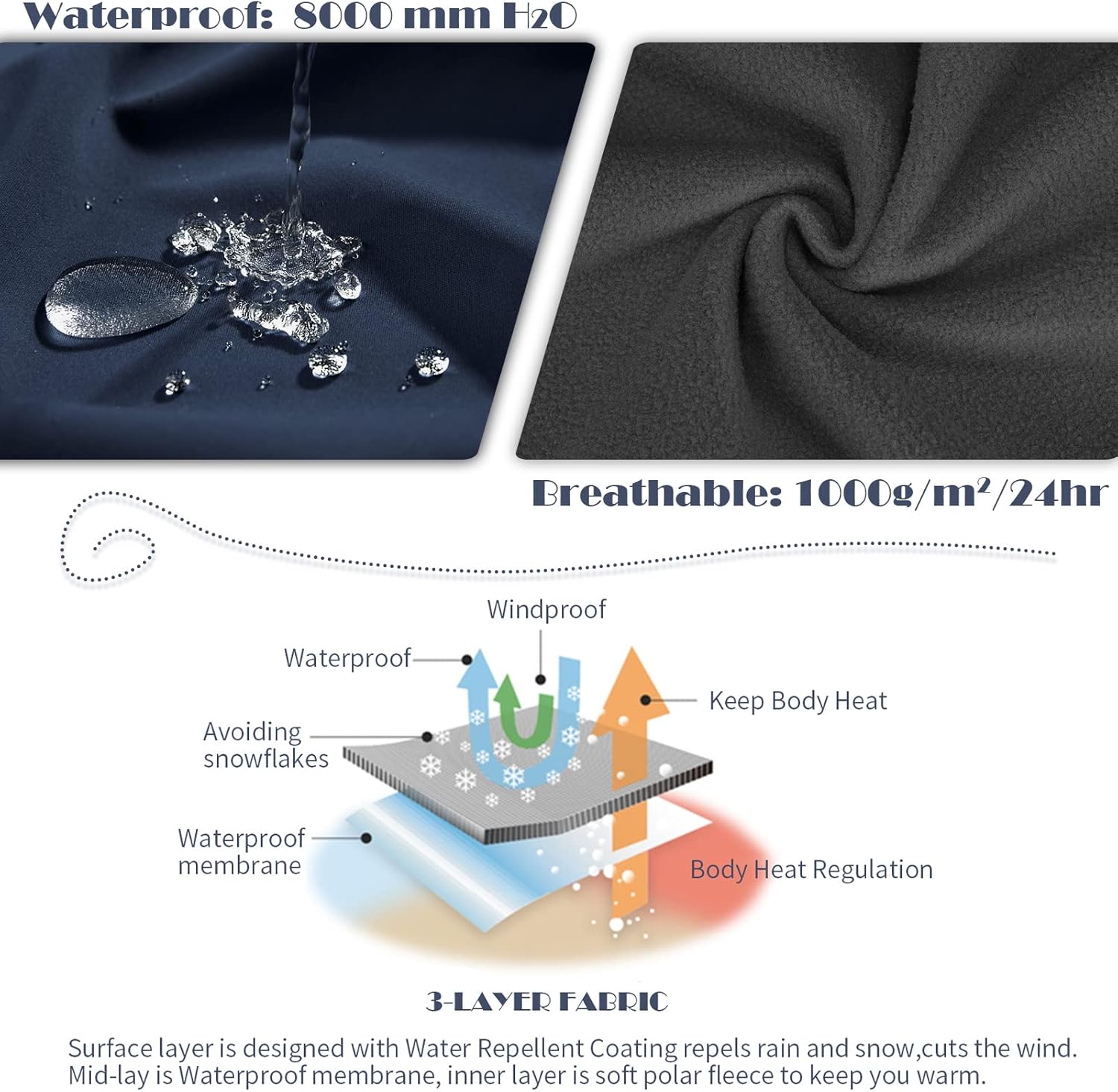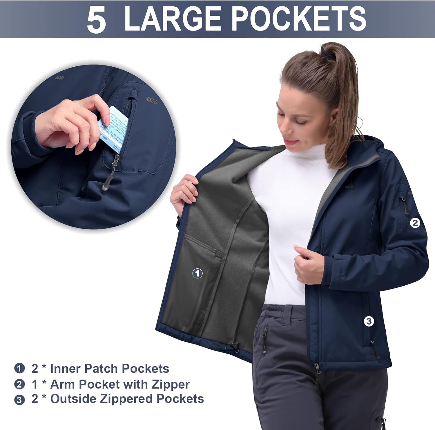 - 【Multifunktionale Taschen】-- Die Softshell-Jacke für Damen verfügt über 5 Funktionstaschen: 1 Ärmeltasche mit Reissverschluss für Ihren Skipass oder Karten; 2 Aussentaschen mit weichem Fleecefutter bieten einen besseren Hitzeschutz für die