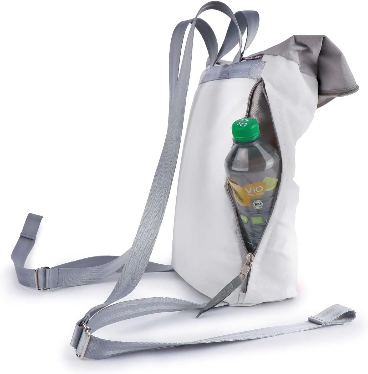 PRODUKTBESCHREIBUNGEN Neuer Look und neuer Kleiner Rucksack 360 Grad hat ein neues einfaches Gurt-System mit einem Rolltop entwickelt, welches mit einem schönen Karabiner befestigt wird. Das beste ist der lang Reissverschluss hinten, wo jetzt eine kleine Trinkflasche verstaut werden kann. Er ist zwar klein, aber ein 13 Zoll Laptop passt locker hinein. Er kann durch den Wickelverschluss nach oben um 1/3 erweitert werden. Jacke oder Pullover können auch unter die Gurt verstaut werden. Weitere Features: aus robustem, wasserabweisendem Segeltuch, grauer Persenning Stoff, 1x grosses Innenfach mit Reissverschluss, 1x Tragegriff, einfach verstellbare 25mm Tragegurte.
