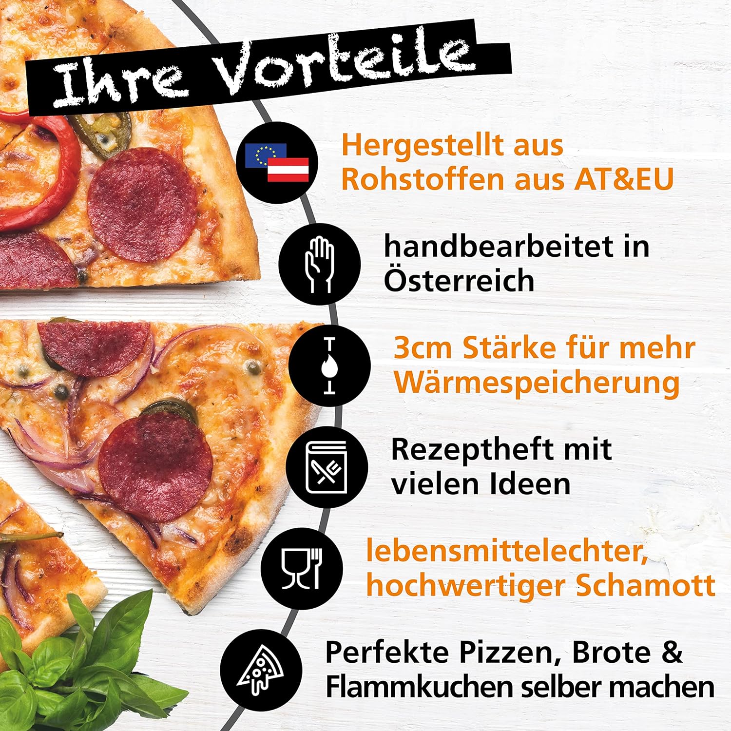 - UNSER ALLROUND STEIN: Simuliere in deinem Backofen die Eigenschaften eines Steinofens und backe Pizzen, Flammkuchen, Brot wie die Profis. Die starke Hitze, die unser 3cm Stein permanent an das Backgut abgibt, wird dich begeistern! Dieser Stein schlägt jede 1,5cm „Chinafliese“ um Längen!