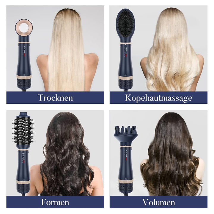 - 4-IN-1-STYLER-SET --- Dieser Warmluft-Styler ist ein multifunktionales Haartrockner Warmluftbürste-Set, das Ihre vielfältigen Styling-Anforderungen perfekt erfüllen kann. Es kann als Haartrockner, Haardiffusor, Haartrocknerbürste und Volumen