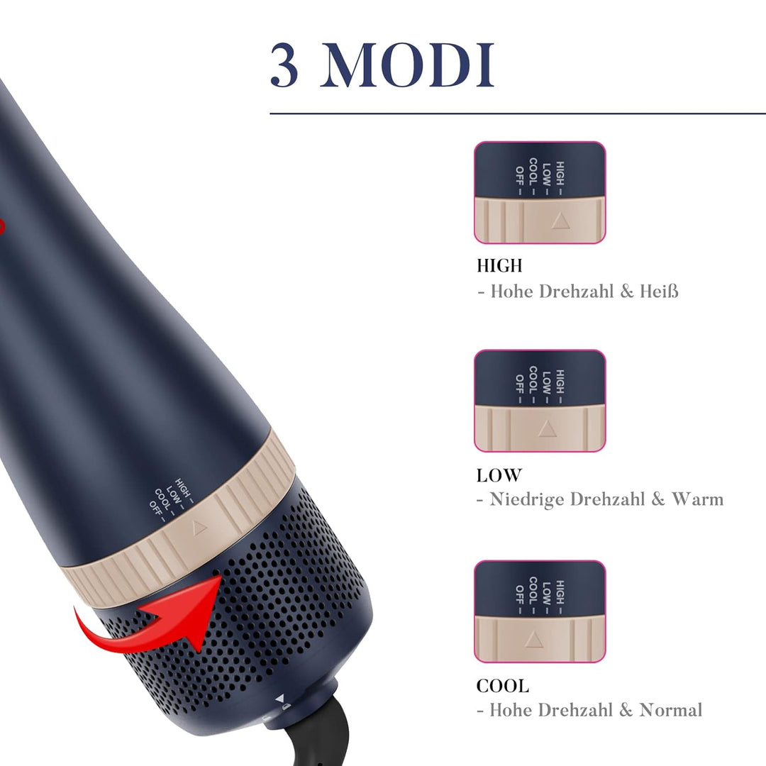- 3 MODI --- Eingebauter 1000-Watt-Motor, schnelles Trocknen und Stylen. 3 Modi Verschiedene Lüfterstufen und Temperaturen sind auf verschiedene Styling-Accessoires abgestimmt, um eine Vielzahl von Styling-Optionen zu ermöglichen. Verwenden Sie die