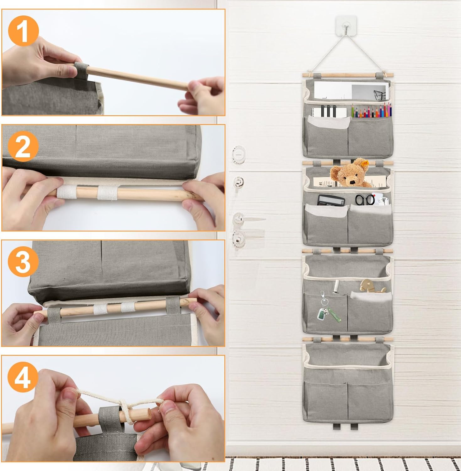 - 🏘Set-Details: Sie erhalten 4 beige Wandaufbewahrungstaschen (23 x 25 x 6 cm) und 4 selbstklebende Haken. Die Wandtasche wird mit einem Holzstab und einem Schlüsselband geliefert, die an die Tür oder Wand gehängt werden können, um für Ordnung im