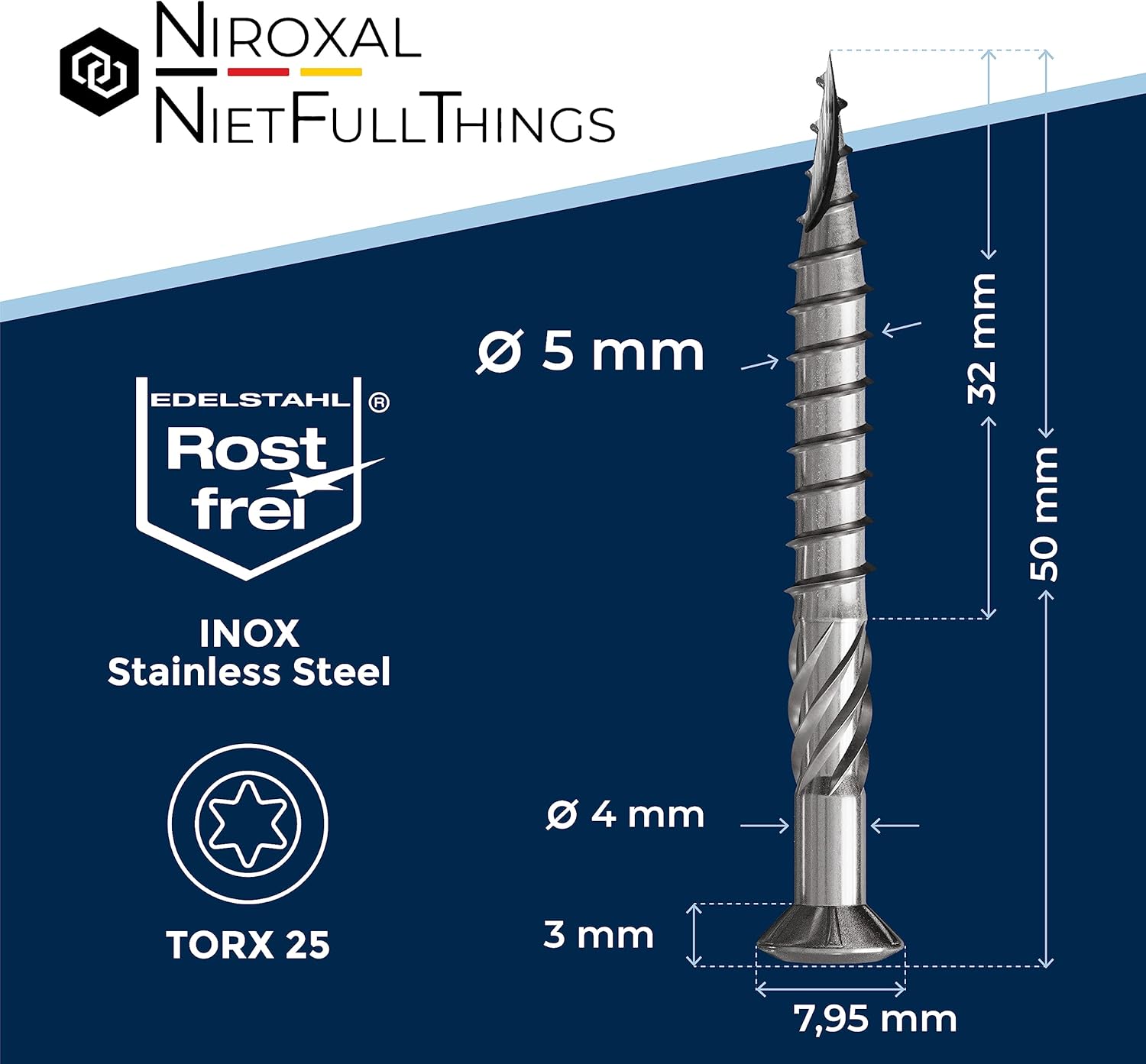 - Für die fachgerechte Montage wird ein Vorbohren und Ansenken der Holzdielen empfohlen - insbesondere bei sehr langen Schrauben. Durch das Ansenken wird ein flächenbündiges Einbringen der Edelstahlschrauben Torx ermöglicht. Das Reibgewinde an