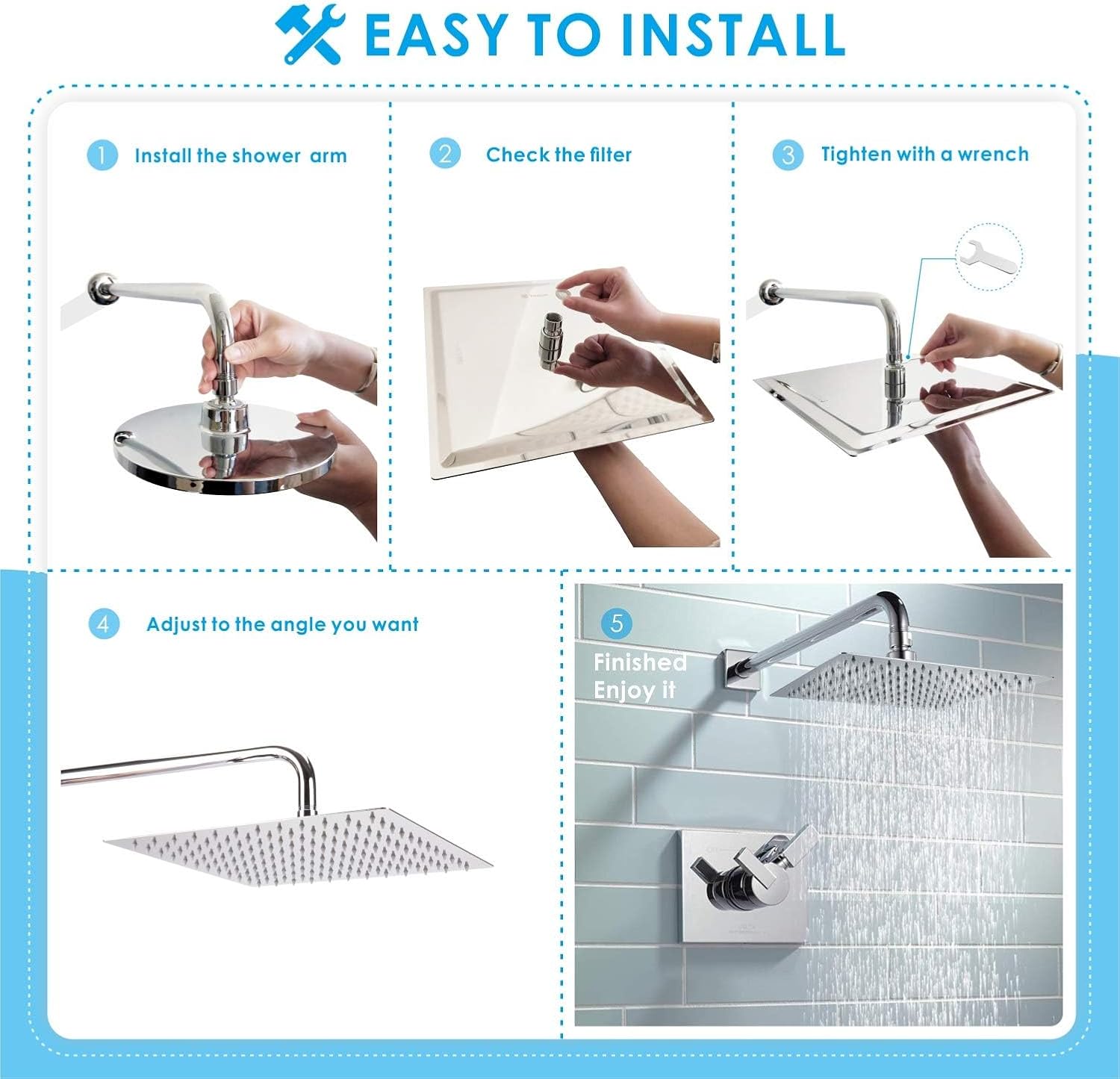 • - Schnelle und einfache Installation ohne Werkzeuge - Installieren Sie es in nur wenigen Minuten an der Wand oder am Duscharm an der Decke. Das G1/2“ Gewinde kann an einen Standard-Duscharm angeschlossen werden. Ein kleiner Schraubenschlüssel wird