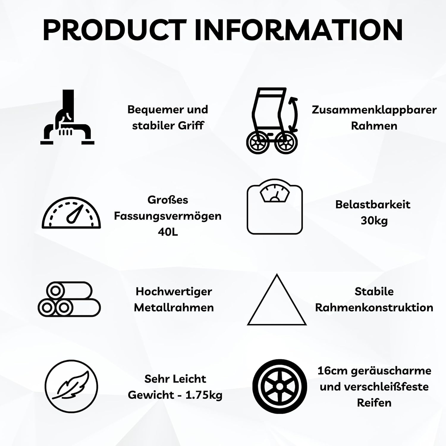 • 👍 40 Liter Volumen - Mit einem grosszügigen Fassungsvermögen von 40 Litern bietet dieser Einkaufstrolley ausreichend Platz für Ihre Einkäufe, ohne dass Sie sich um Platzmangel sorgen müssen. Dadurch können Sie bequem und effizient Ihre