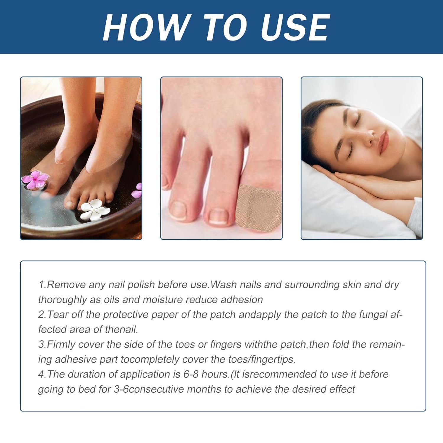 - 【Easy to Use】Tear off the protective film on the Nail Patches and stick them on toes or fingers. Use for 6-8 hours (recommended before bedtime) and continue to use for 1 month.
