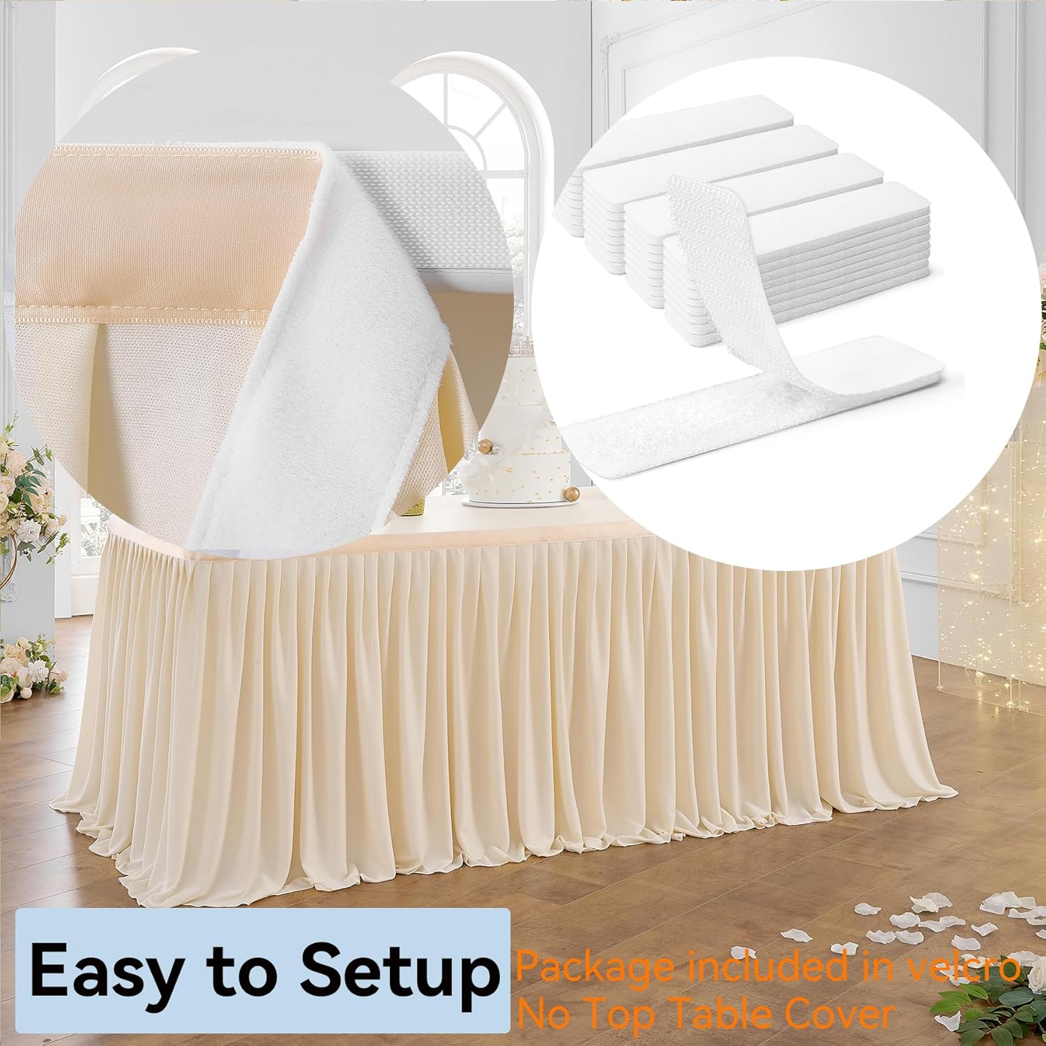 - Einfach einzurichten - Rüschen rechteckiger Tischrock genäht mit Schleife unter der oberen Kante und Paket kommen mit Haken, Sie müssen nur Haken auf den Tisch legen und Klettverschluss zusammen kleben, DONE, es ist sehr einfach und einfach.