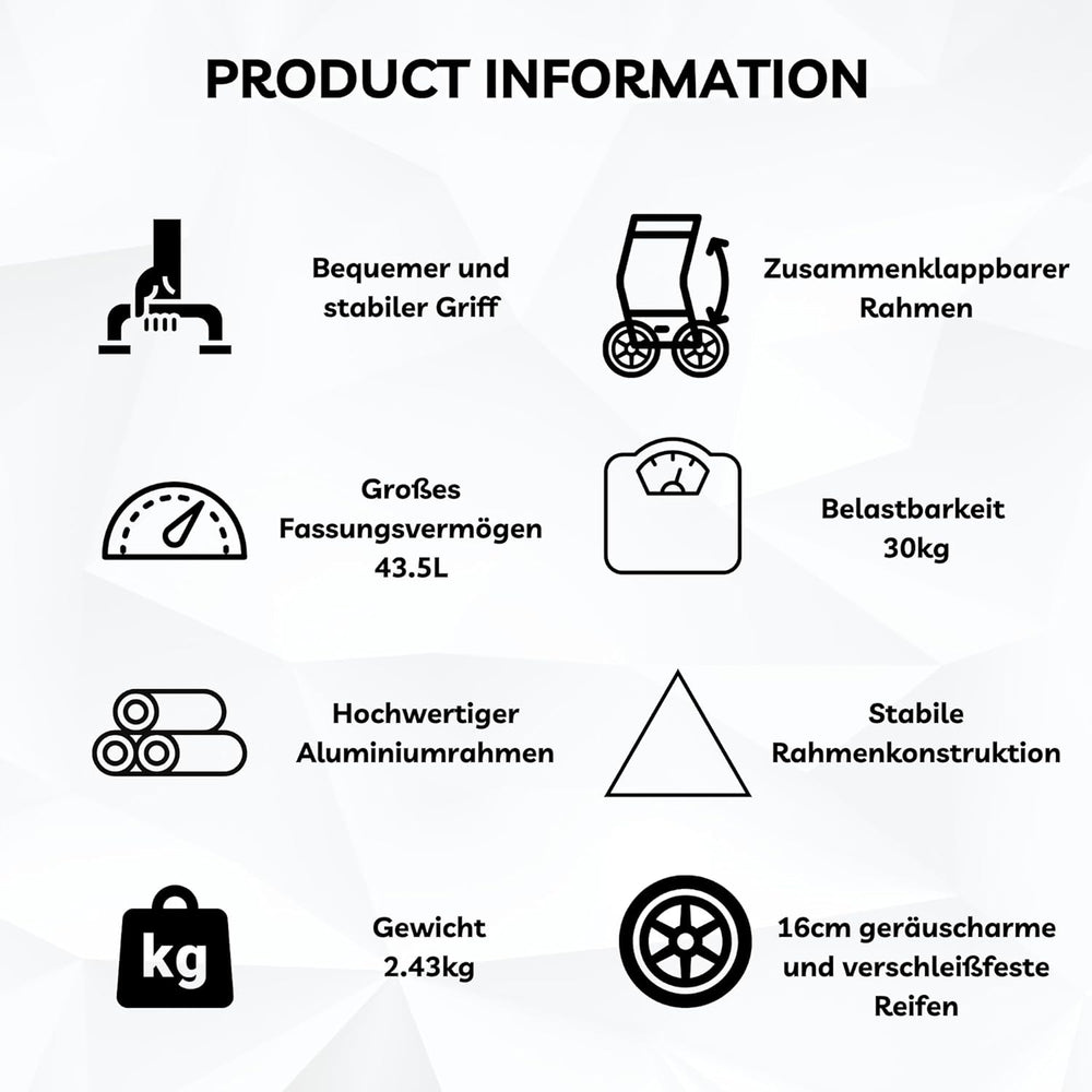 - 🛒 44 Liter Volumen - Mit einem Volumen von 44 Litern bietet der Trolley reichlich Platz für Ihre Einkäufe. Der hochwertige Aluminiumrahmen sorgt in Kombination mit einer robusten Stahlstruktur für Stabilität, während der Einkaufswagen dank seines