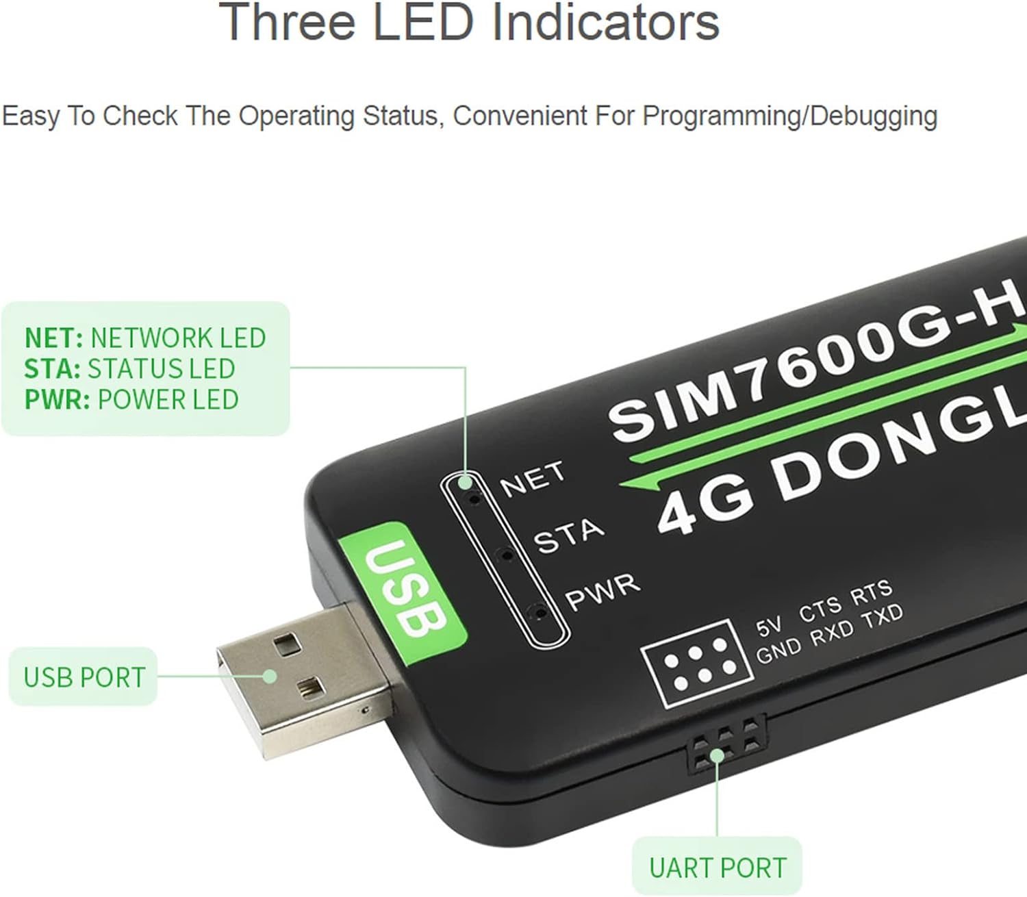 • DREI ANZEIGELEUCHTEN: Das SIM7600G-H 4G DONGLE-Modul verfügt über drei Datenanzeigeleuchten, Sie können den Arbeitsstatus leicht erkennen, NET: Internetanzeige, SAT: Statusanzeige, PWR: Stromanzeige.