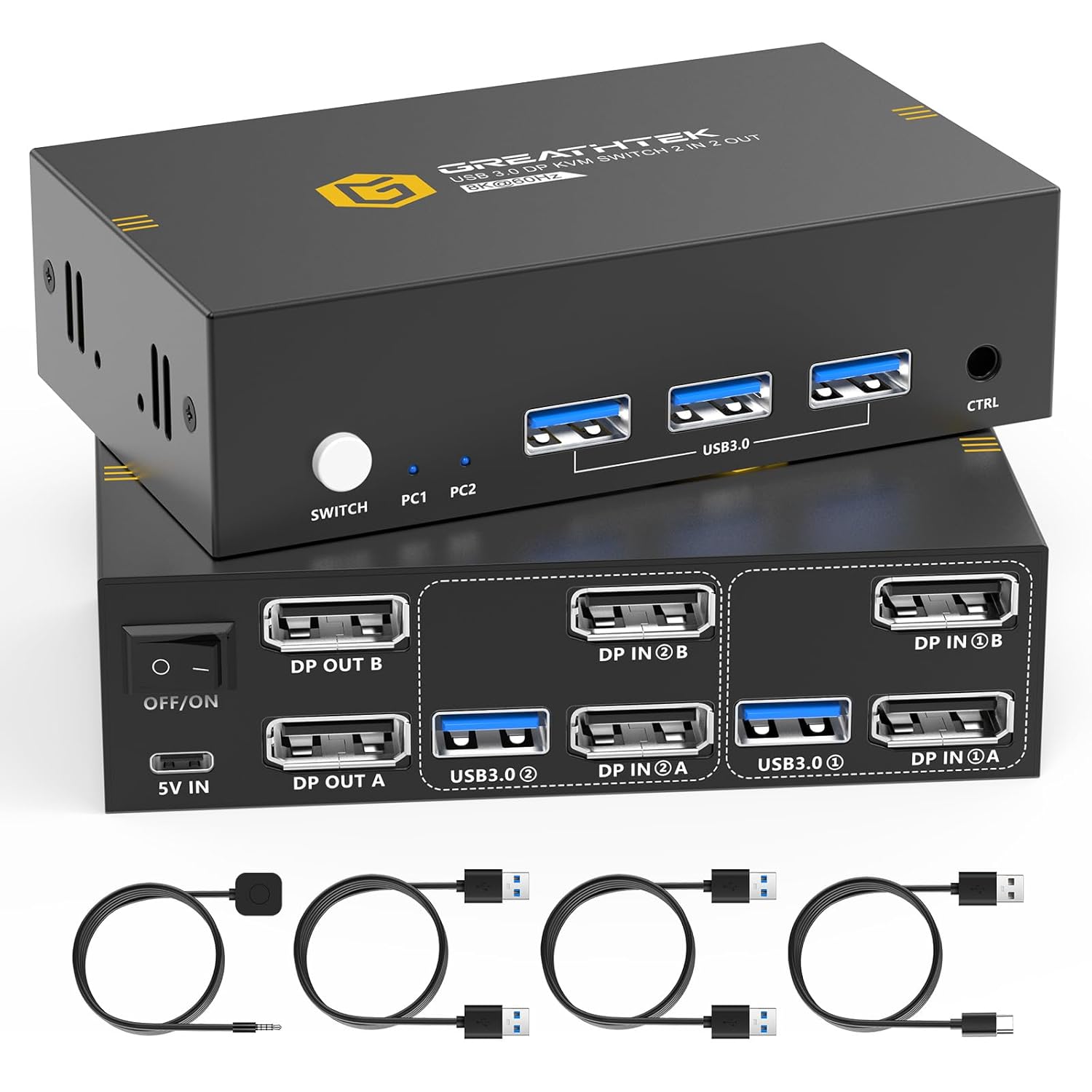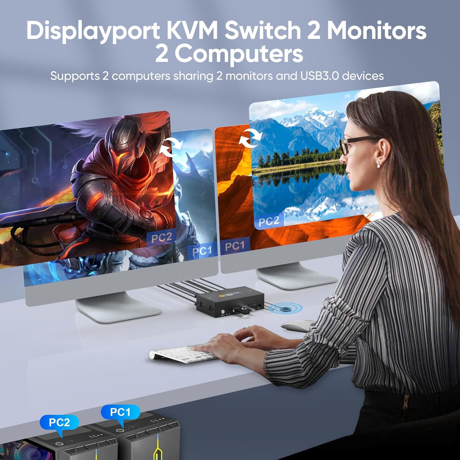 - 【Displayport KVM Switch 2 PC 2 Monitore】 KVM Switch Displayport können sich zwei PCs eine Tastatur,eine Maus und zwei Monitore teilen, Drücken Sie einfach den Umschaltknopf (2-4 Sekunden lang), um schnell zwischen den beiden Computern zu wechseln.
