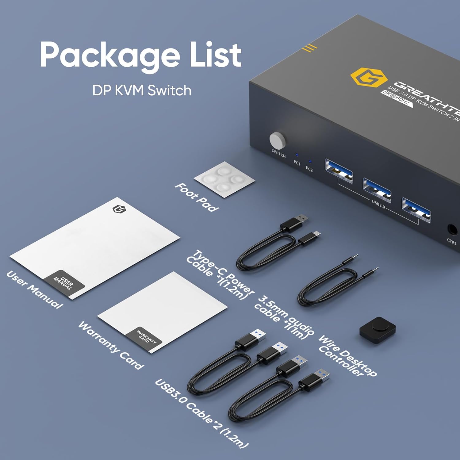 - 【Das Set enthält】 1 x DP 2*1 KVM Switch Host, 1 x verdrahtete Desktop Controller, 2 x USB-A auf USB-A USB 3.0 Kabel, 1 x USB-A auf USB-C Stromkabel, 1 x 3.5MM Audiokabel, 1 x Benutzerhandbuch, 1 x Garantiekarte und 4 x rutschfeste