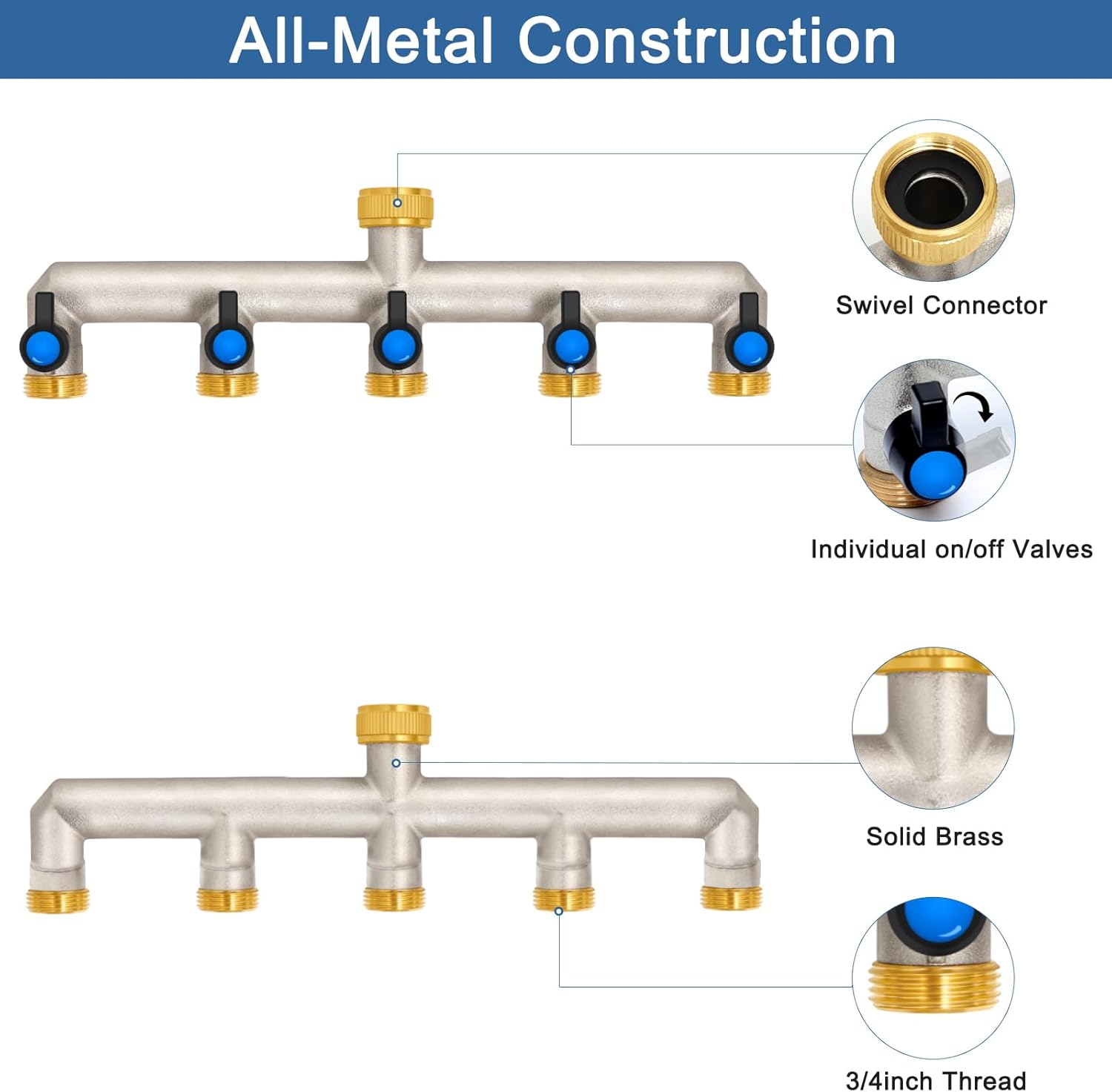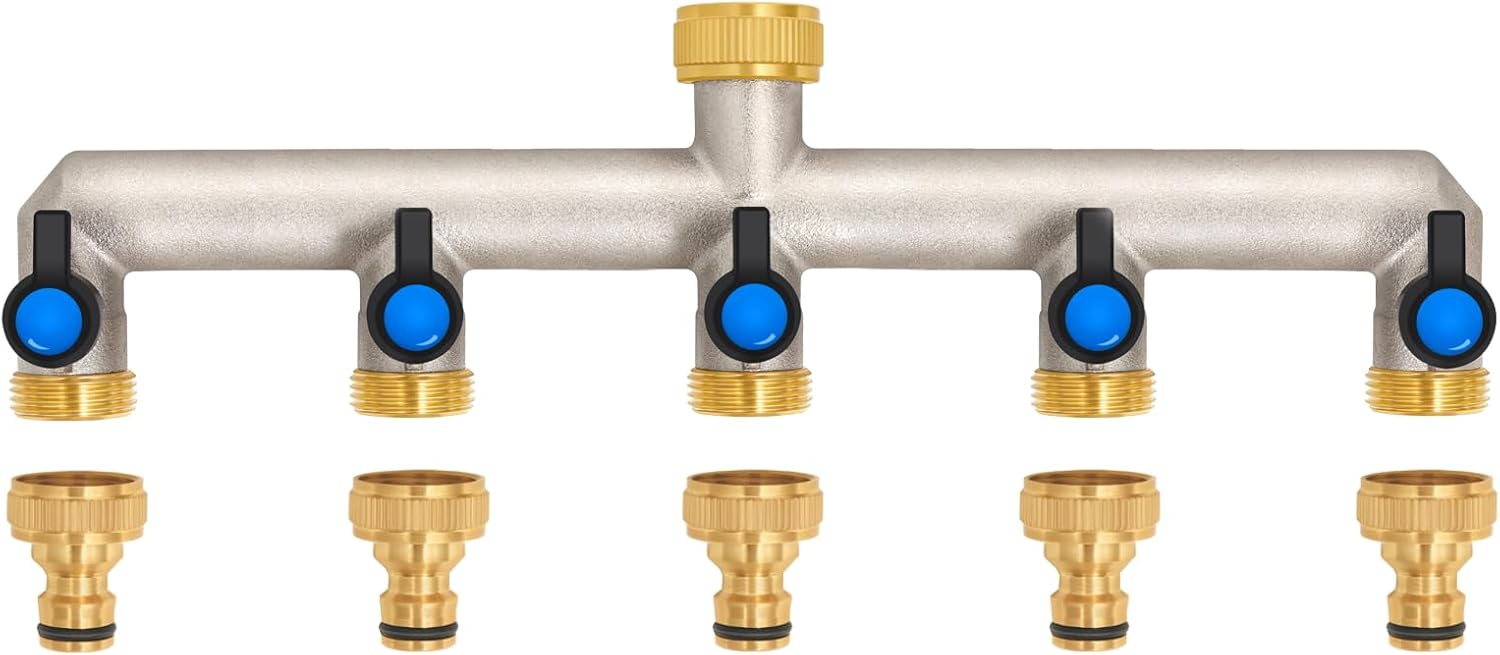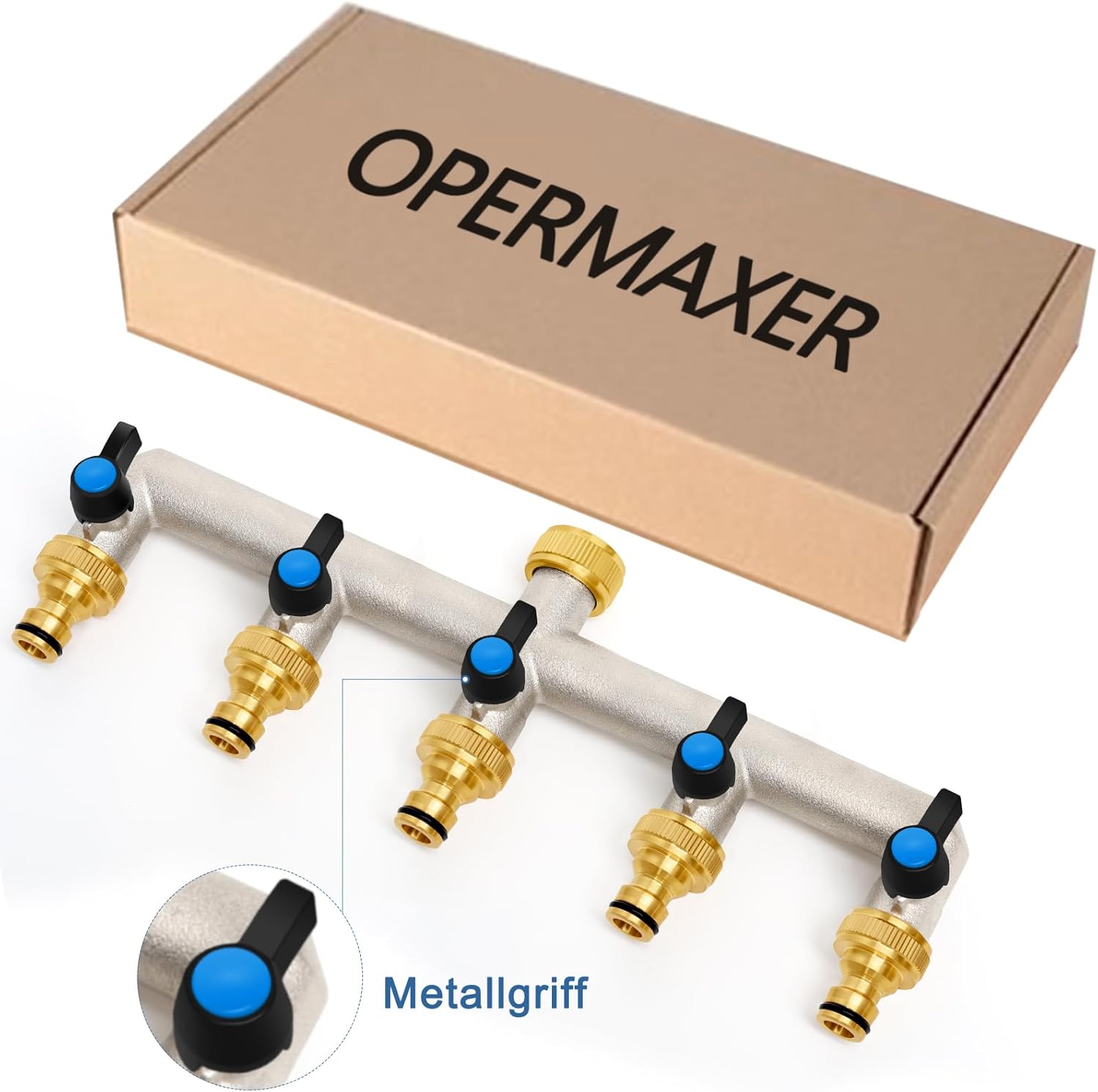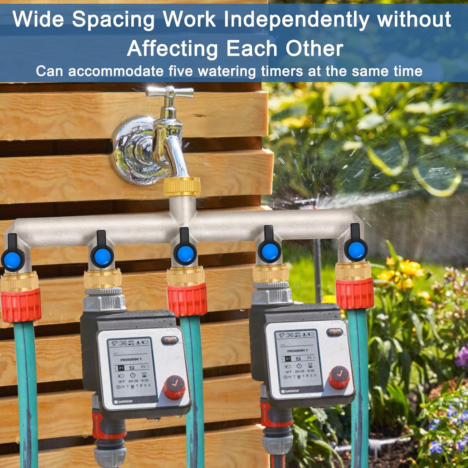 - 【Multifunktional】5-Wege Verteiler aus Messing mit Absperrkugelhähnen. Hahnverteiler für den Anschluss von 5 Geräten/Schläuchen. Einsetzbar in Gärten, Garagen und überall dort, wo eine ausreichende Bewässerung erforderlich ist.