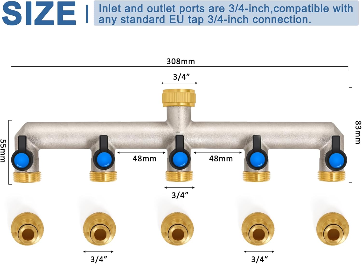 - 【Technische Daten】Geeignet für in Europa gebräuchliche G 3/4" Hähne, 3/4" Innengewinde(ø24mm) zur Verteilung des Wasserflusses auf ein 5-Wege Ventil mit 3/4" Aussengewinde(ø26mm).Und wird mit 5 Messingadaptern für den Anschluss an 1/2"