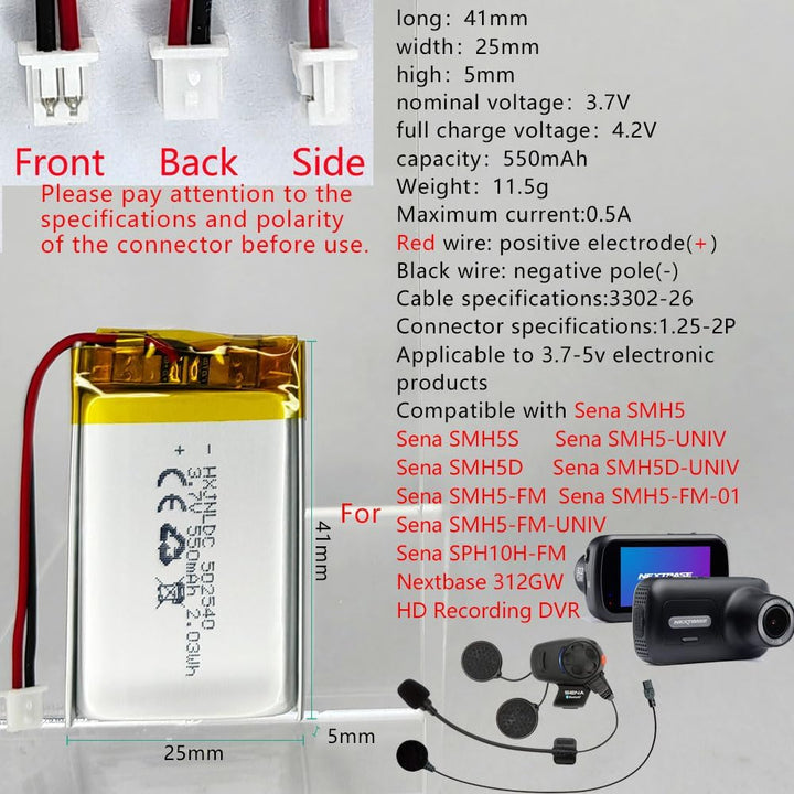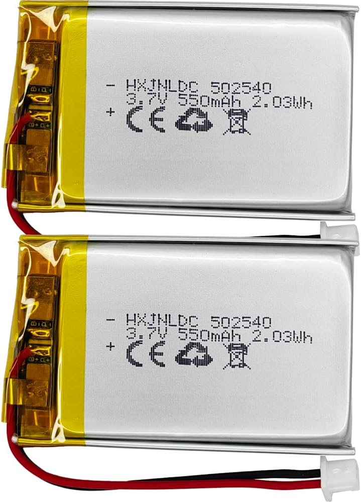 - ★ Wiederaufladbarer Lithium-Ionen-Polymer-Akku 502540, Nennspannung 3,7V, volle Ladespannung 4,2 V, Kapazität 550 mAh, Leistung 2,03 Wh, Grösse 1,58 x 0,98 x 0,2 Zoll (40 × 25 × 5 mm) (L * B * T), Gewicht: 0,405 Unzen (11,5 g) , Maximaler Strom: