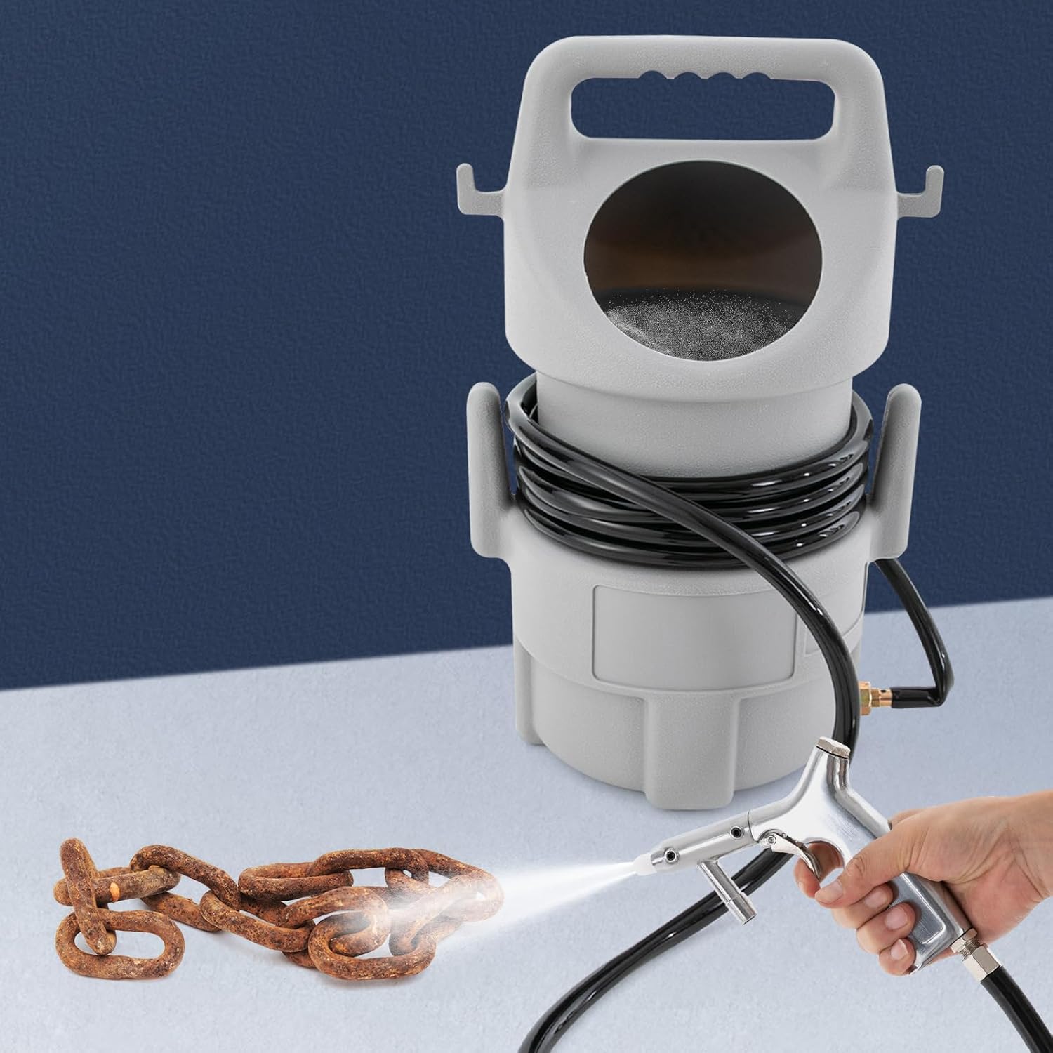 - Leicht zu transportieren: Der ergonomische Griff des Sandstrahleimers liegt gut in der Hand und das kompakte und leichte Design (4,41 lbs) ermöglicht es Ihnen, dieses Produkt einfach und bequem zum Sandstrahlarbeitsplatz zu tragen.