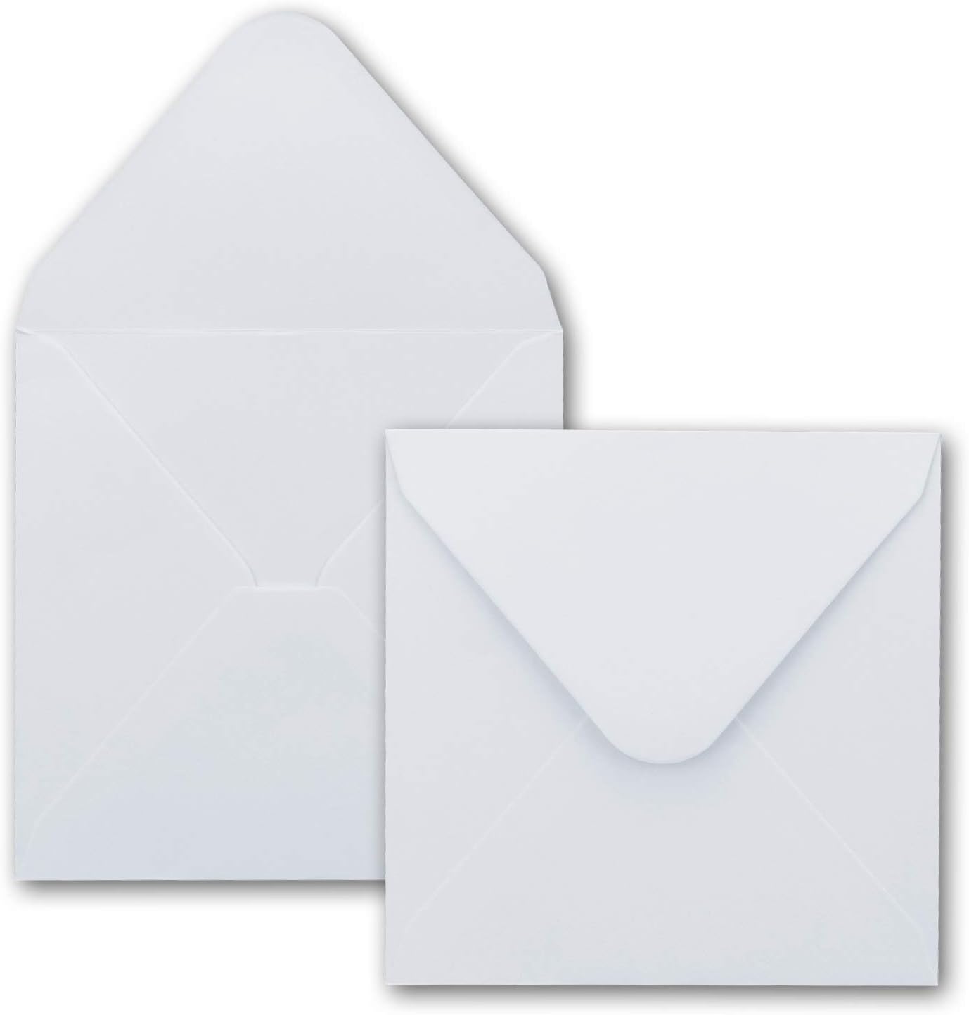 - Format Umschläge: quadratisch - Grösse 135 x 135 mm // Grammatur: 120 g/m² // Kuvert ohne Futter, ohne Fenster // Nassklebung // Verschluss: Spitzklappe // Farbe: Weiss (hochweiss)