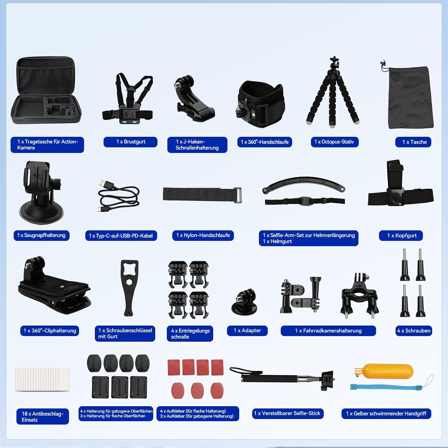 - [Multifunktionaler Einsatz]: Das Action-Kamera-Zubehörset beinhaltet: 1 grosse Tasche, 1 Brusthalterung, 1 Saugnapf, 1 Selfie-Stick, 1 einfache Handgelenkhalterung, 1 Aufbewahrungstasche, 1 Schraubenschlüssel, 1 Ladekabel, 1 J-Clip, 1