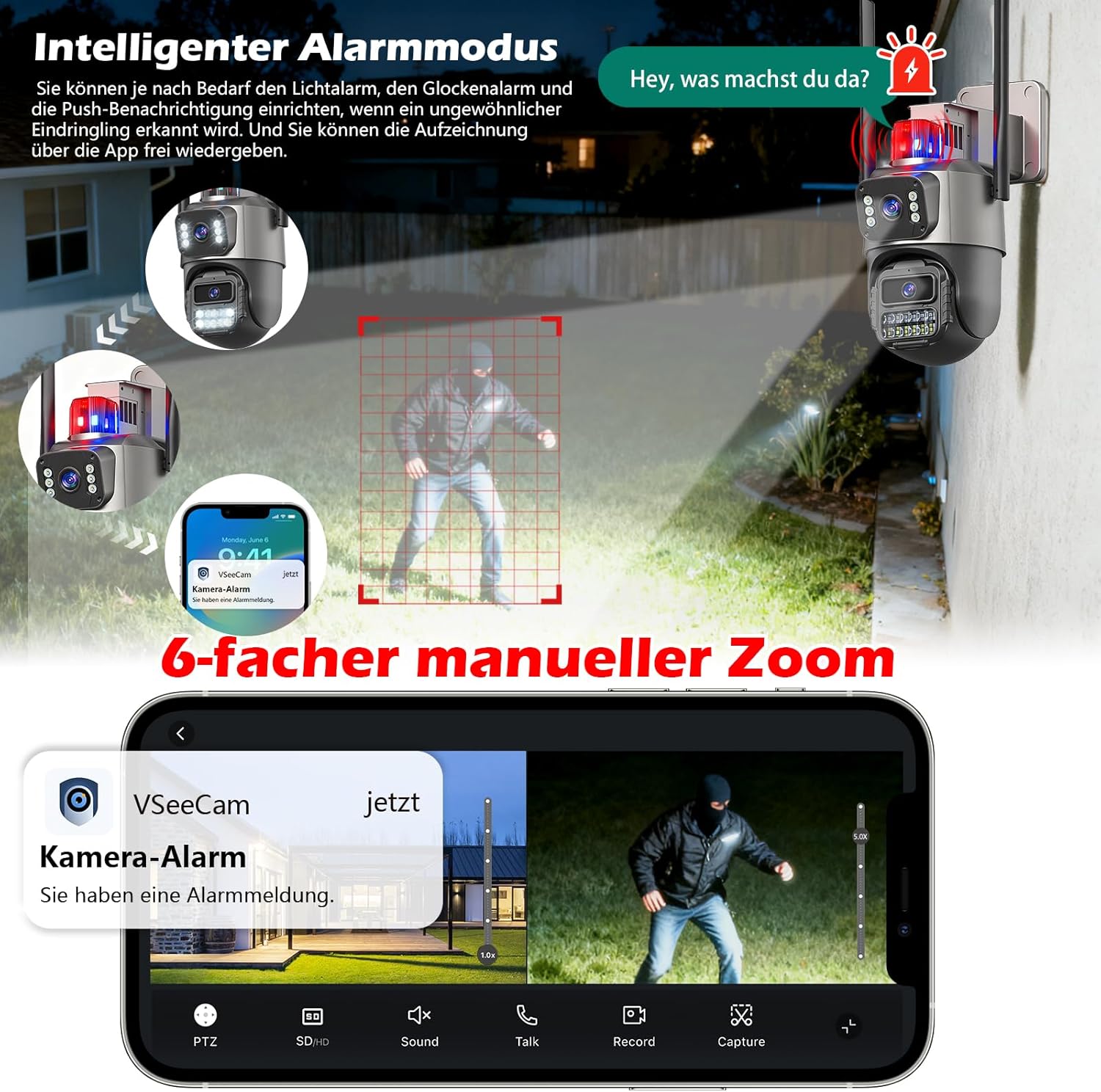 - 【6X PTZ Aussenüberwachungskamera mit Bewegungserkennung】Die 5G wlan Aussenkamera mit zwei Objektiven kann zwei Bereiche gleichzeitig erfassen und durch den 6-fachen Zoom auf jedem Bildschirm reichhaltigere Details anzeigen. Die 6-MP-Heimkamera (3 MP