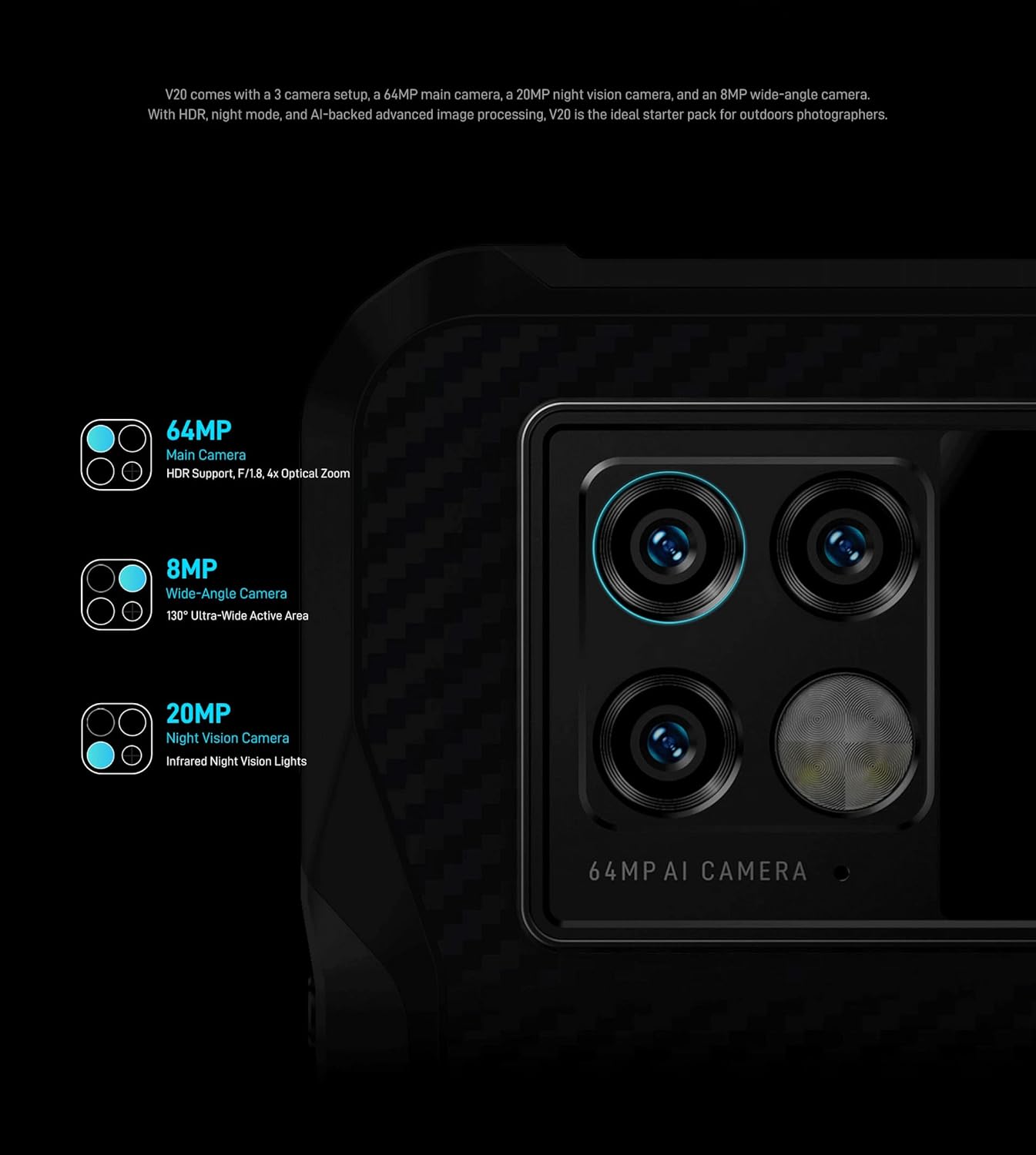 - ★【Fangen Sie unvergessliche Erinnerungen mit Klarheit ein:】V20 kommt mit einem 3-Kamera-Setup, einer 64MP Hauptkamera, einer 20MP Nachtsichtkamera und einer 8MP Weitwinkelkamera. Mit HDR, Nachtmodus und AI-gestützter fortschrittlicher Bildverarbeitung ist das V20 das ideale Einsteigerpaket für Outdoor-Fotografen.