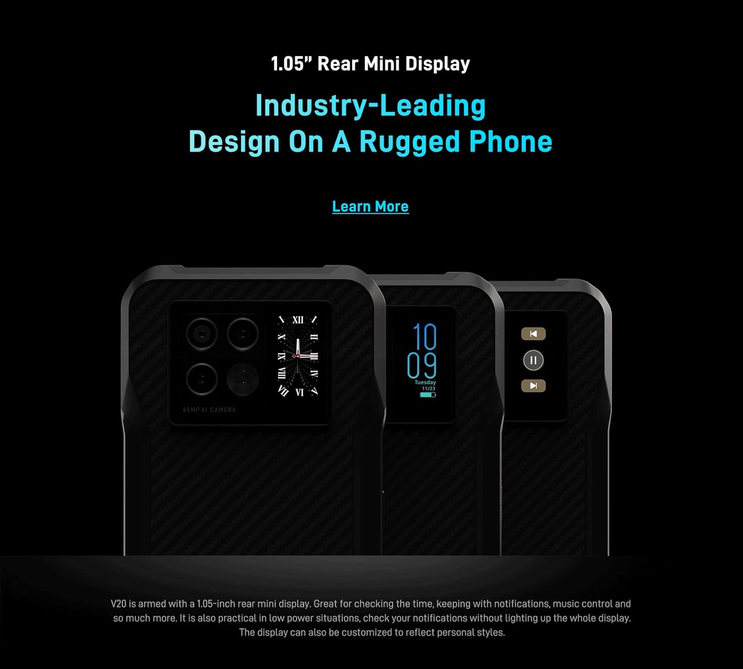 - ★【1,05" Rückseitiges Mini-Display, branchenführendes Design auf einem robusten Telefon:】V20 ist mit einem 1,05-Zoll rückseitigen Mini-Display ausgestattet. Es eignet sich hervorragend zum Überprüfen der Uhrzeit, zum Abrufen von Benachrichtigungen, zur Musiksteuerung und vielem mehr. Es ist auch praktisch in Situationen mit niedrigem Stromverbrauch. Überprüfen Sie Ihre Benachrichtigungen, ohne das gesamte Display zu beleuchten. Das Display kann auch an dem persönlichen Stil angepasst werden.