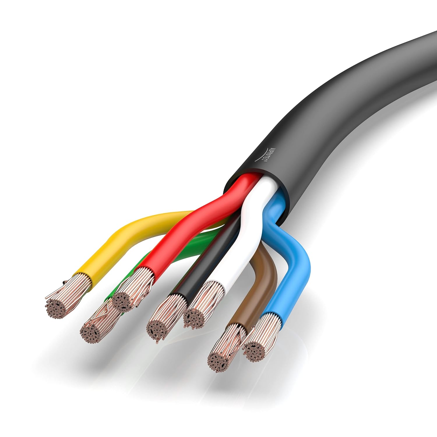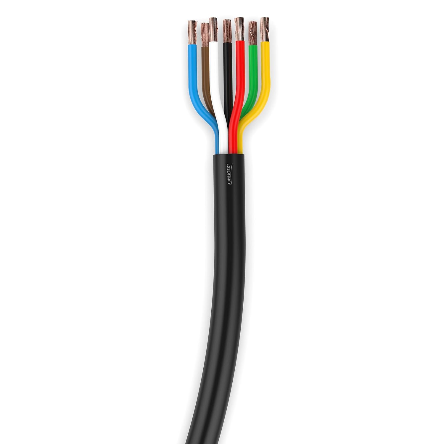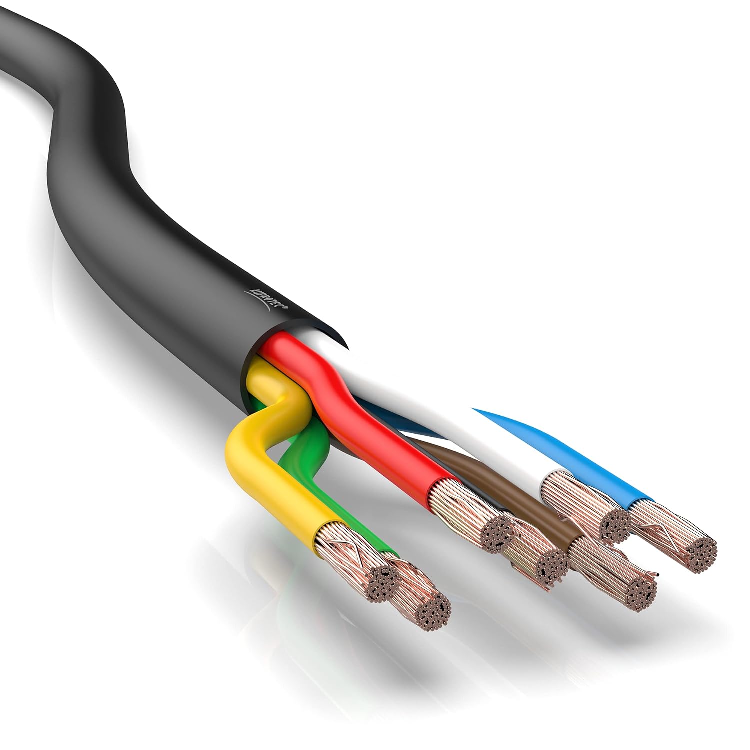 - Adern farbcodiert (1,5mm²) schwarz, braun, gelb, grün, rot, blau + (2,5mm²) weiss, Mantel schwarz PVC