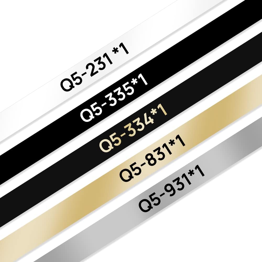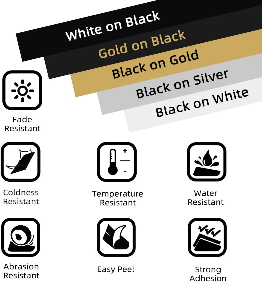 - Verpackung und Farben: 5 Rollen Etikettenbänder in der Verpackung. Farbe: Gold auf Schwarz/Weiss auf Schwarz/Schwarz auf Gold/Schwarz auf Silber/Schwarz auf Weiss. Breite: 12 mm. Länge: 4 m