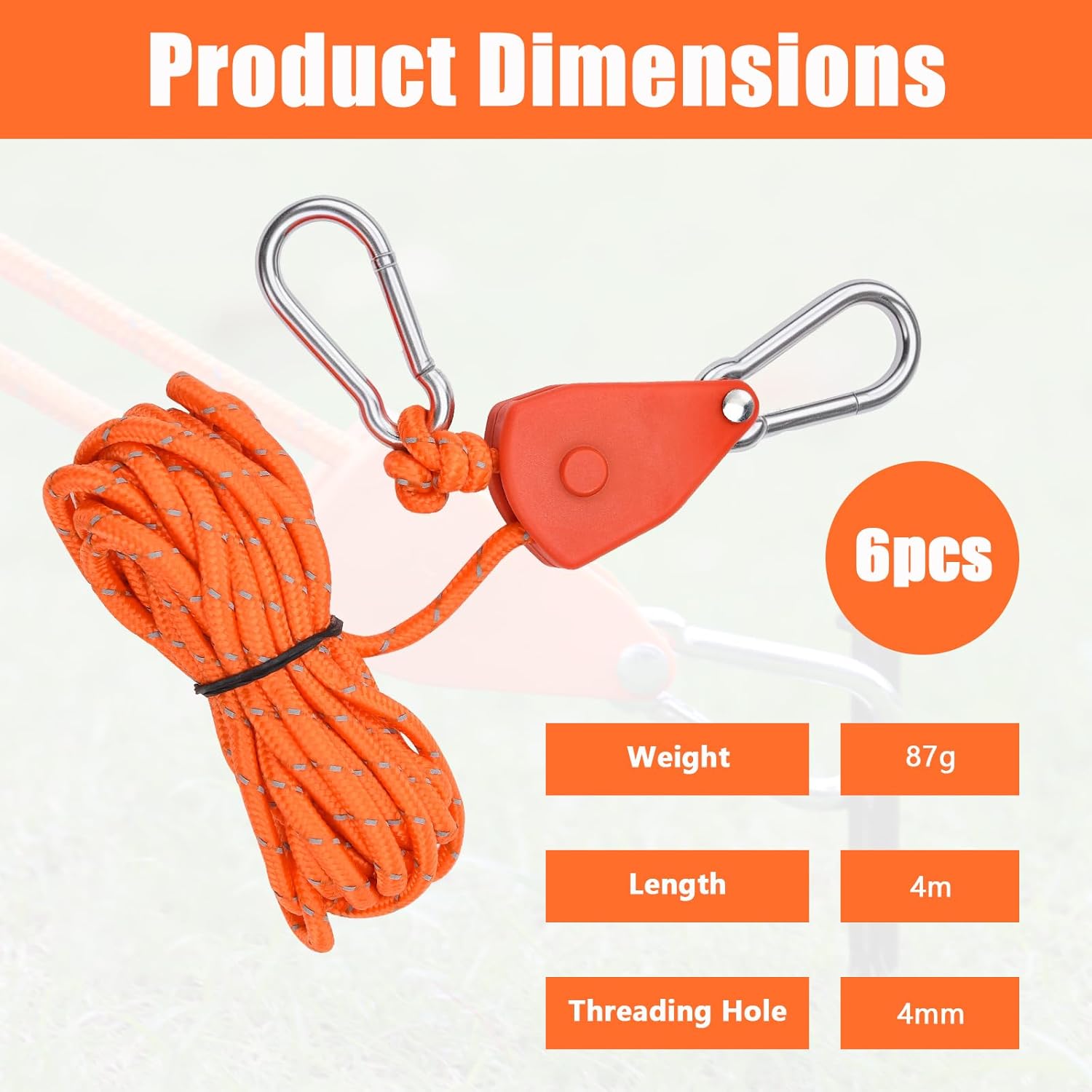 - 【Abspannseile Camping】Sie erhalten 6 orangefarbene, reflektierende, verstellbare abspannseile camping. Jedes Ratschenseil ist 4 Meter lang, hat einen Durchmesser von 4 mm und wiegt 87 Gramm.