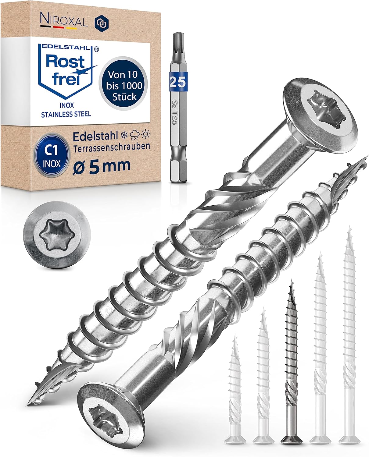 - TOP: 1 passender Torx Bit im Lieferumfang enthalten. PERFEKT für Esche, Lärche, Bangkirai, Douglaise, Bambus, Gerutu, Ipe, Lapacho, Iroko, Kambala, Kaput und Walaba Schrauben für Terrassendielen mit der Werkstoffklasse C1 zeichnen sich durch ihre
