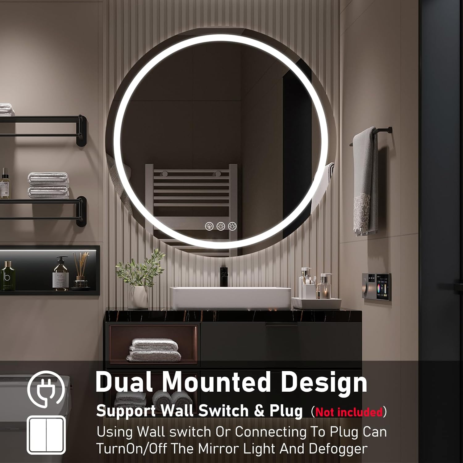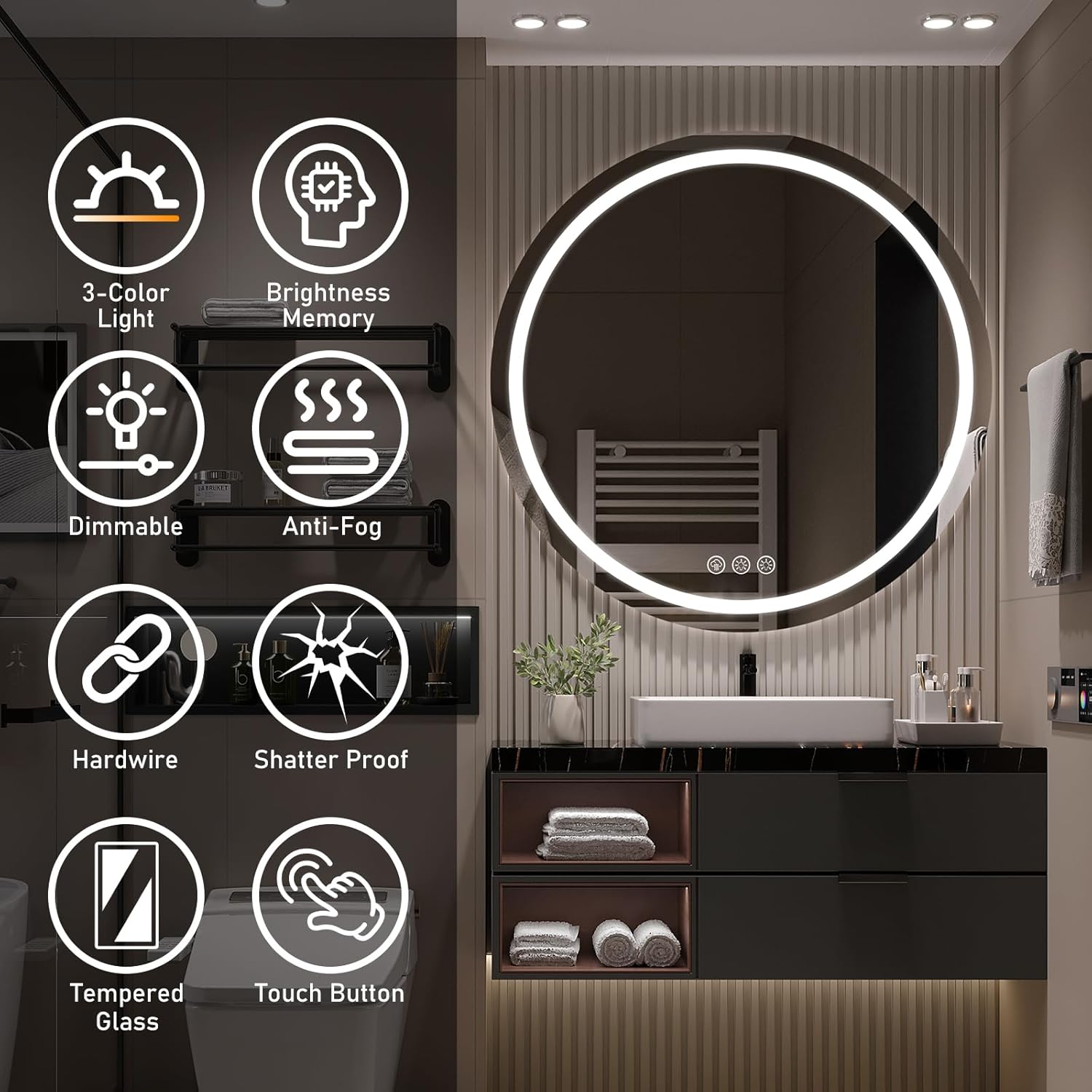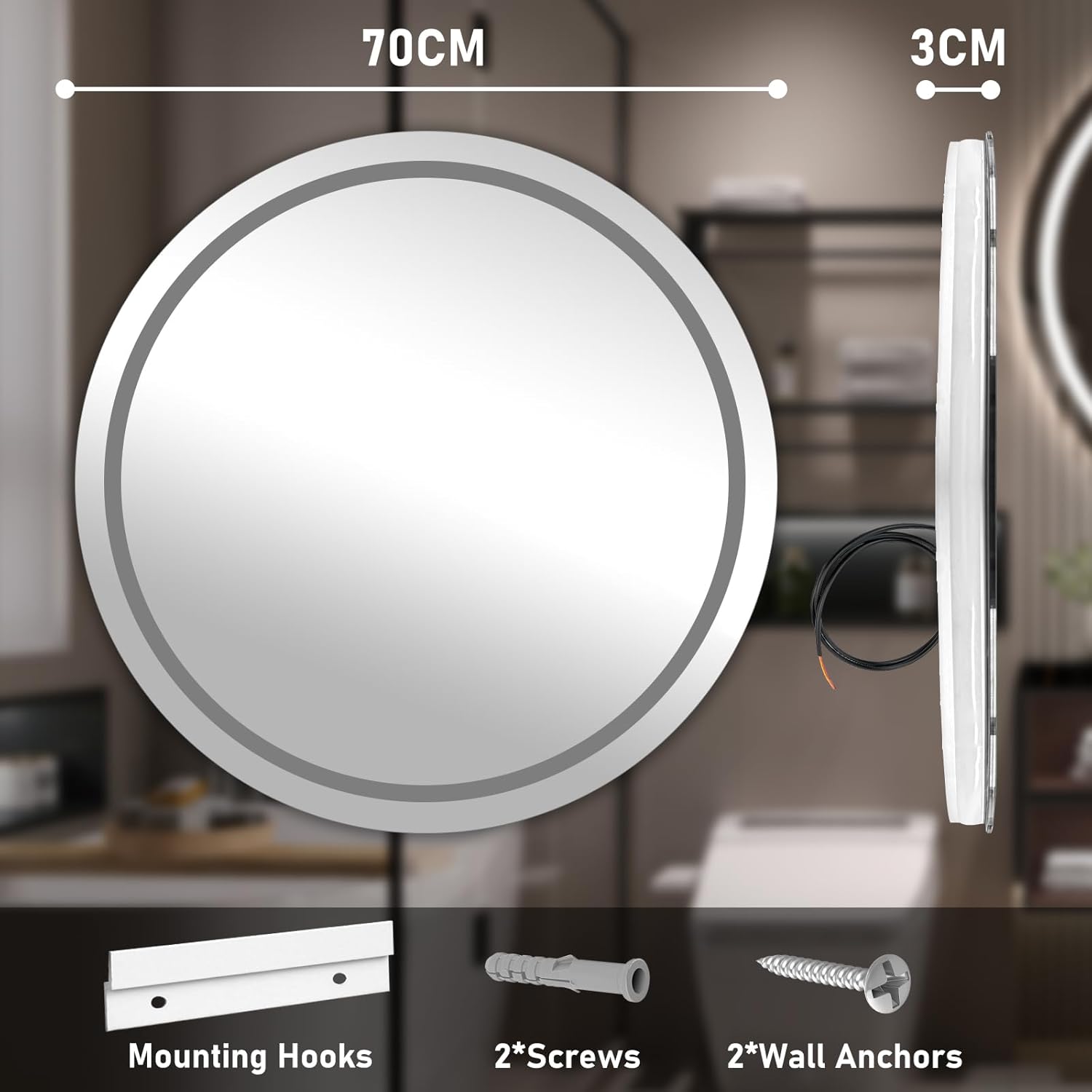 - 【Anti-Beschlag-Funktion】Dieser LED-Badezimmerspiegel verfügt über eine Anti-Beschlag-Funktion. Berühren Sie einfach den Anti-Beschlag-Knopf, und der Spiegel wird innerhalb von 5–10 Minuten vollständig klar. Er ist sicher, energieeffizient und