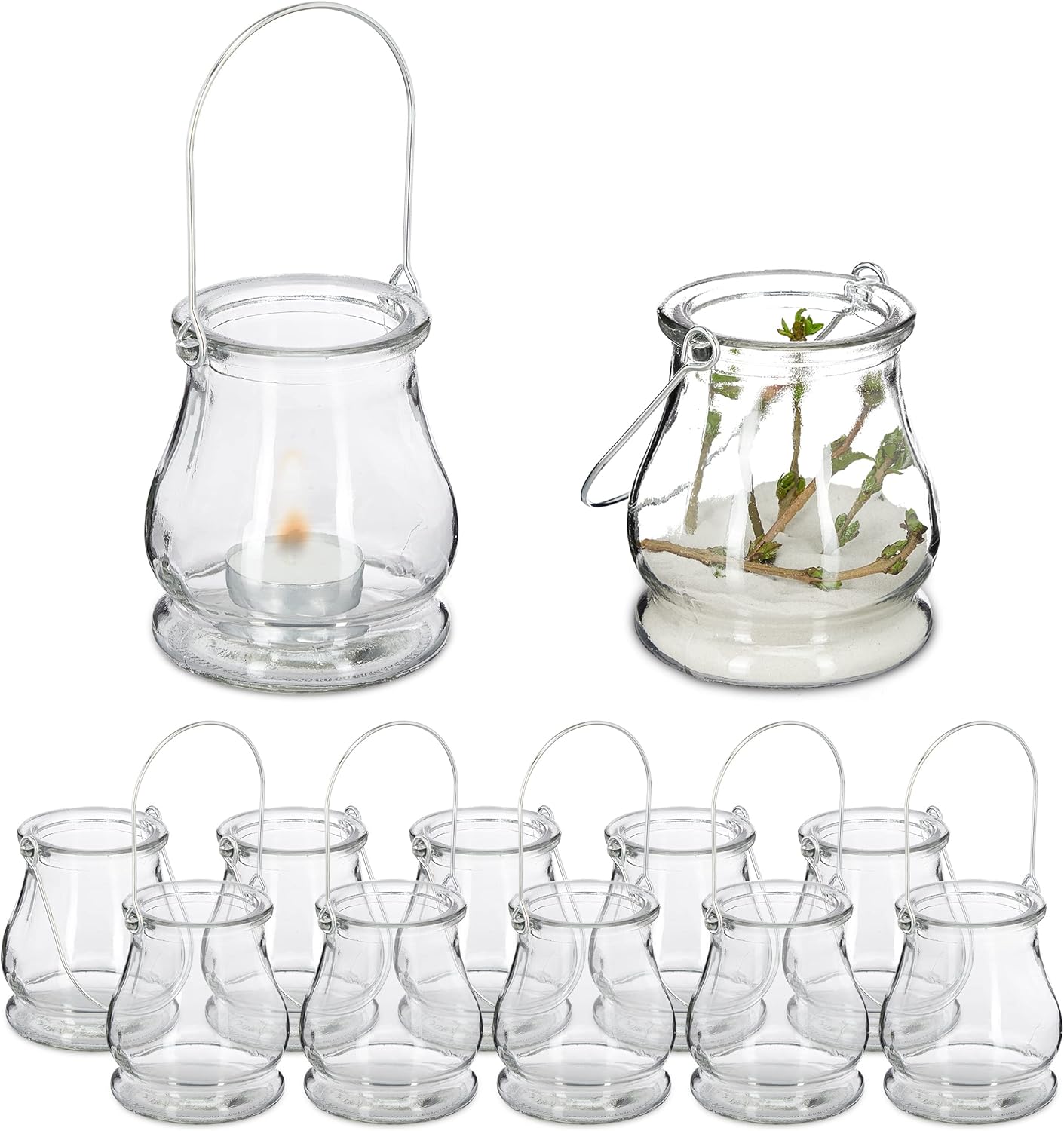 - 72er Set: Transparente Windlichter für Teelichter in bauchiger Form - Silberner Henkel zum Aufhängen