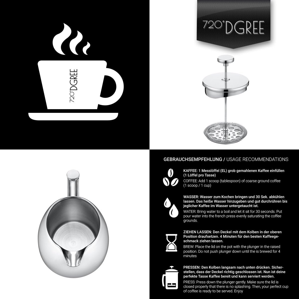 - ✔ DU BIST 100% ZUFRIEDEN ODER GELD ZURÜCK - Sei dir deiner Investition sicher. 720°DGREE steht für HERAUSRAGENDEN DEUTSCHEN KUNDENSERVICE mit tausenden GLÜCKLICHEN KUNDEN. Falls du den Kaffeebereiter nicht absolut lieben solltest, schick diesen einfach innerhalb von 60 Tagen zurück und wir erstatten dir den vollen Betrag - ohne Wenn & Aber! Lege dir deine Premium French Press JETZT in den Einkaufswagen.