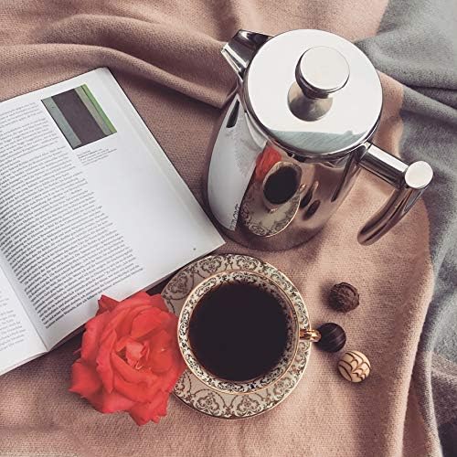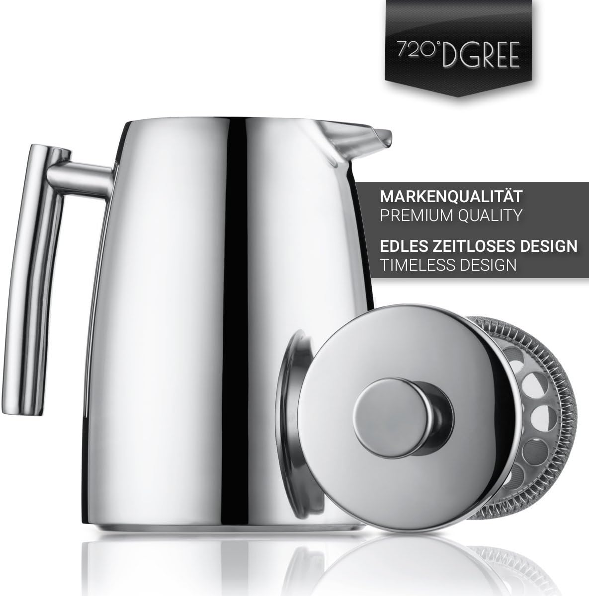 - 🛡 KeepDGREE-TECHNOLOGY - Doppelwand, vakuum Design hält deinen Kaffee oder Tee während des Frühstücks warm und bleibt aussen trotzdem kühl - ohne Verbrenn-Gefahr. COOL TOUCH GRIFF - Komfortabel & Sicher pressen. GUT AUSSEHEN - Dank stylischem Mirror Finish zeigt sich deine French Press immer von ihrer besten Seite. Inklusive Gratis eBook "Kaffee - Das Schwarze Gold".