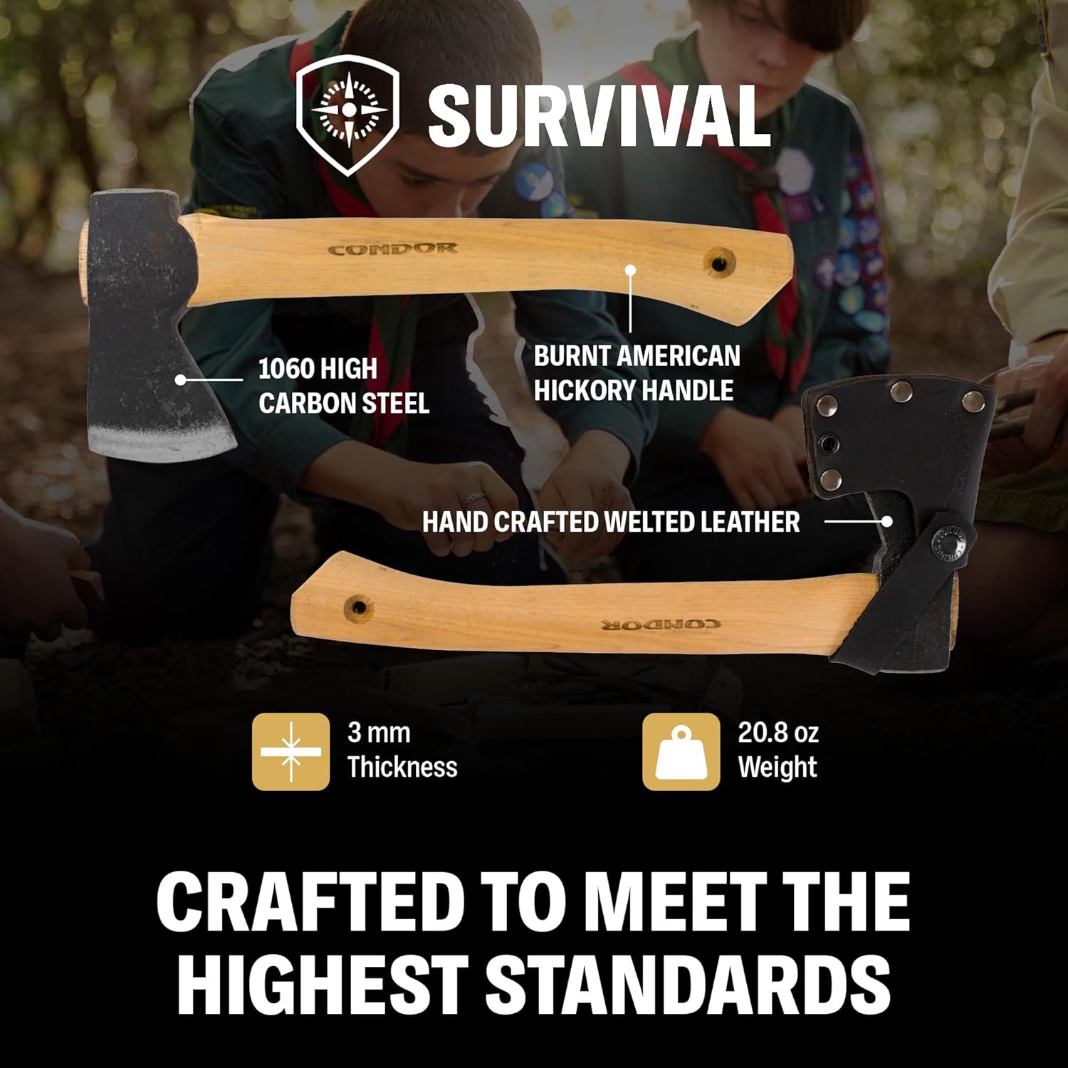 PRODUKTBESCHREIBUNGEN Axt Beil Scout Beil Stelle von Condor. Messen Sie insgesamt 25.65 cm. Stahl Kopf 1045 Carbon 11,3 cm mit Schneide gesch�rft. Holz Griff mit Schl�sselband Loch. Scheide enthalten.