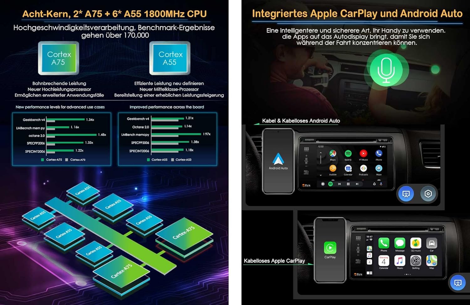 - 【Android 12- 4GB RAM+64GB ROM】Octa Core, 2* A75 + 6* A55 64-bit 1800MHz CPU, Benchmark Ergebnisse gehen über 170.000. Canbus Decoder enthalten, unterstützen Lenkradsteuerung. Unterstützt 2 Karten & 3 USB bis zu 4* 256GB erweiterten Speicher.