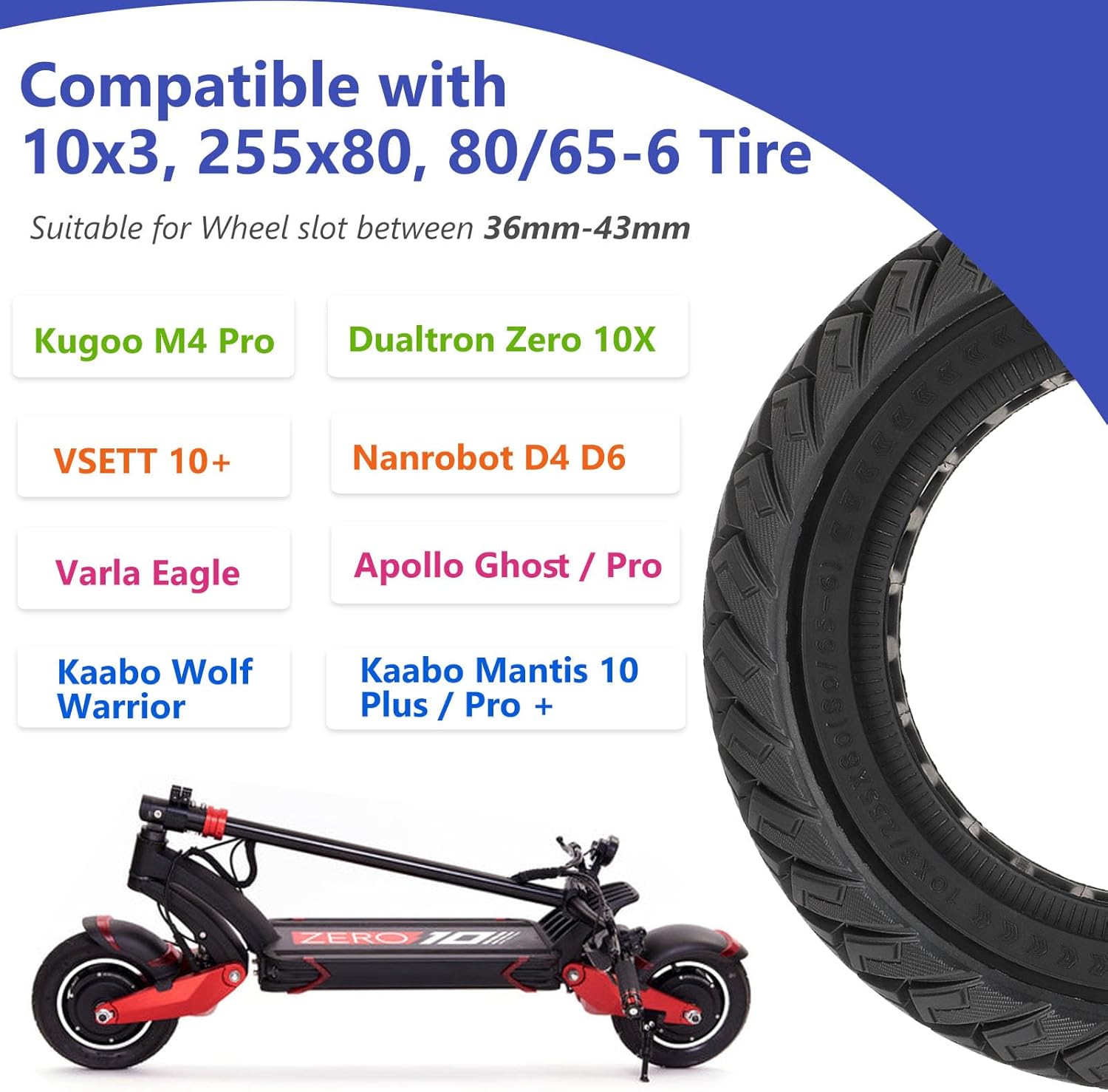 - [Für 10 Zoll Scooter] Geeignet für den Austausch von drei originalen 10-Zoll Reifentypen: 10 x 3, 255 x 80 und 80/65-6. Kartensteckplatzbreite 42 mm. Bitte überprüfen Sie vorab Ihr Originalreifenmodell und die Grösse auf der offiziellen Website des