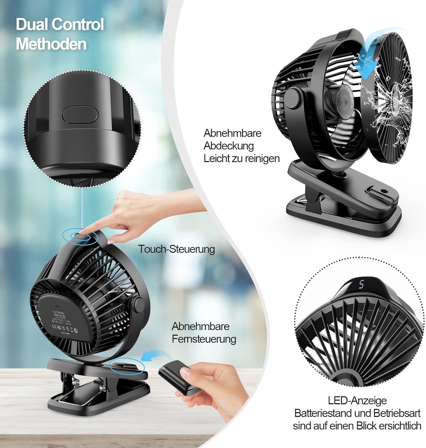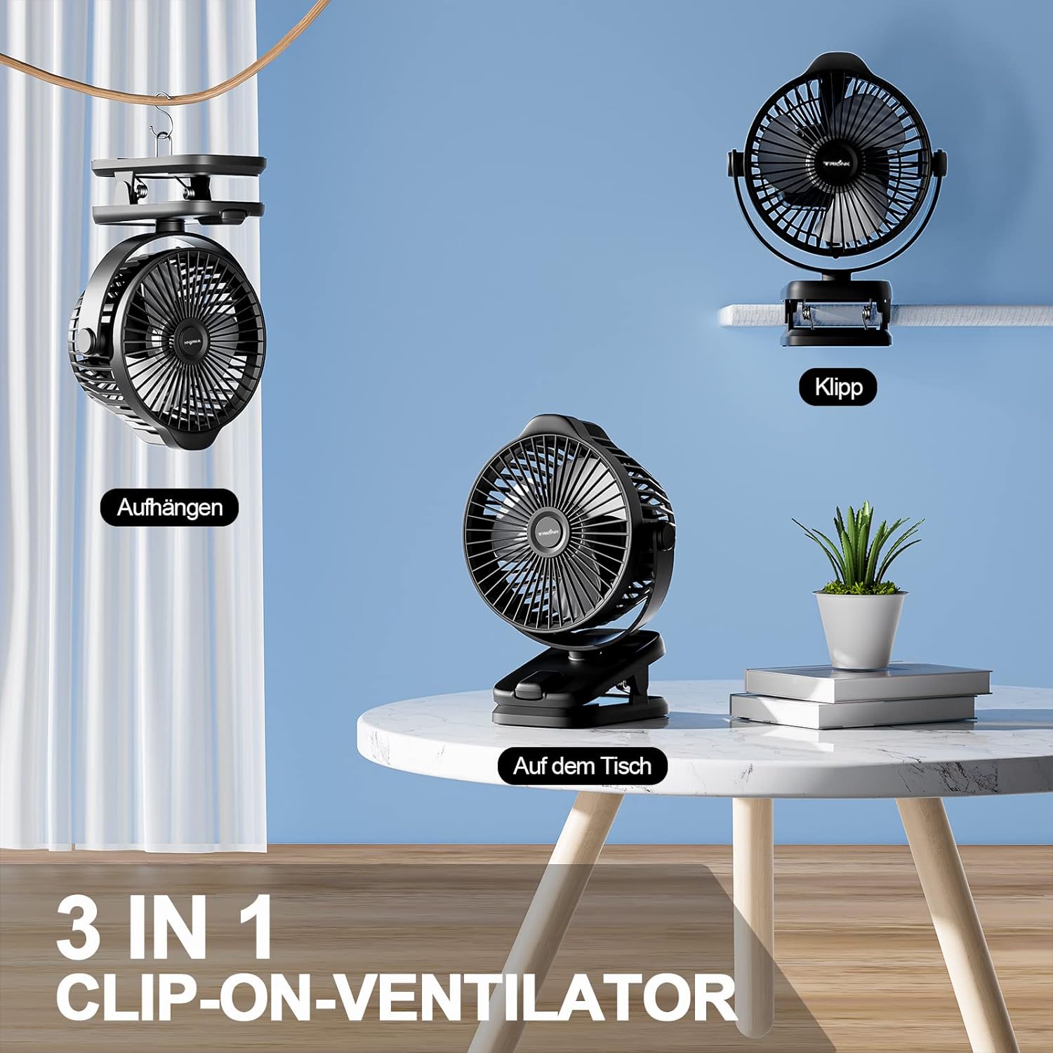 - đă3-in-1 Multifunktions-Ventilatoră- Der TRILINK Clip-on-Ventilator kann in vielseitigen Szenarien verwendet werden, wie zum Beispiel am Rand eines Schreibtisches, an Balken, an einem Kinderwagen, am Rahmen eines Laufbandes oder sogar auf dem