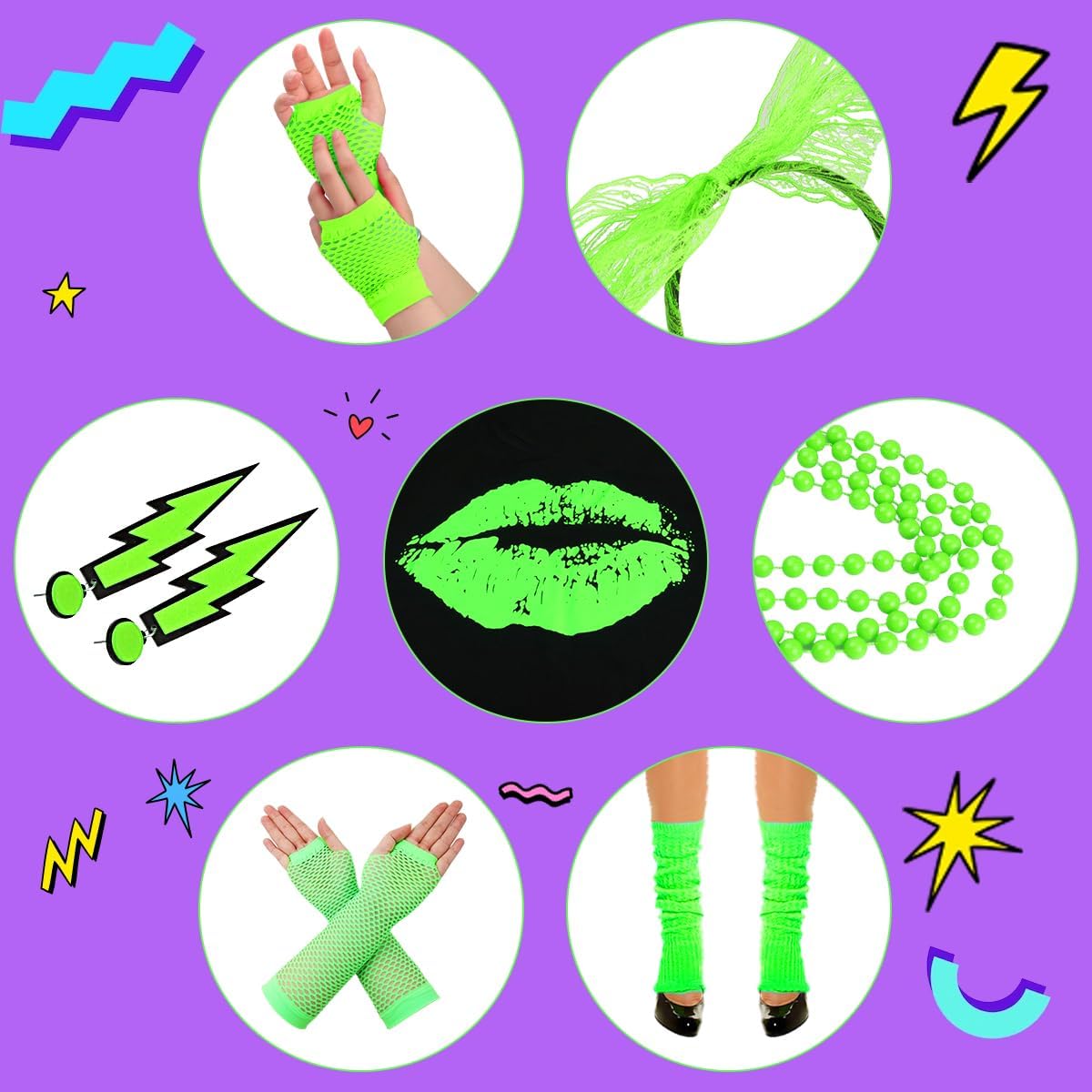 - 💋 [Hervorragende Neonfarben]: Die leuchtenden Farben jedes Accessoires lassen Sie glänzen und attraktiv aussehe, lassen Sie in der Menge anders aussehen. Neon Netzhandschuhe, rote Lippen drucken T-Shirt, Halsketten, Ohrringe, Armbänder die besten