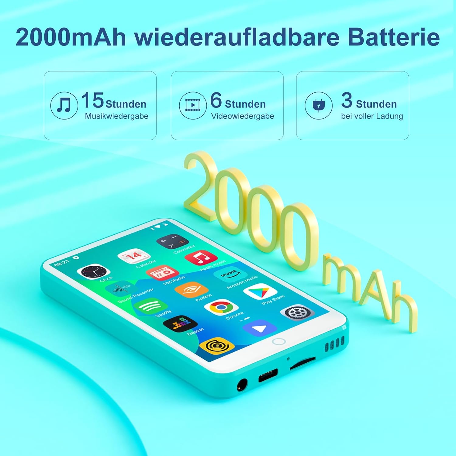 • 【Unleash Endless Entertainment】Unser MP4-Player verfügt über einen leistungsstarken 2000mAh-Akku mit USB-C-Schnellladung. Geniessen Sie bemerkenswerte 20 Stunden mit Bluetooth-Kopfhörern, 35 Stunden mit kabelgebundenen Kopfhörern und 5-6 Stunden