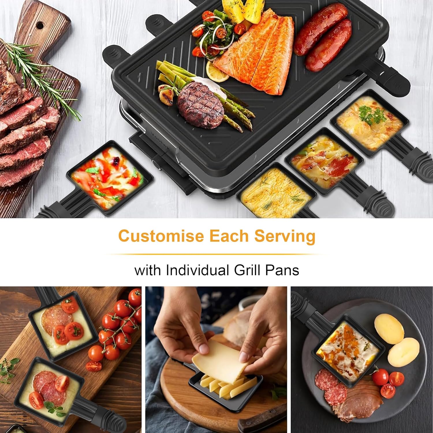 - Raclette-Vergnügen: Mit dem Raclette Grill Pfännchen Set können in gemütlicher Runde 8 Pfännchen mit leckeren Zutaten bestückt und Gemüse, Fleisch oder Vegan auf der Grillplatte überbacken und Raclette-Käse geschmolzen werden. So geniessen Sie