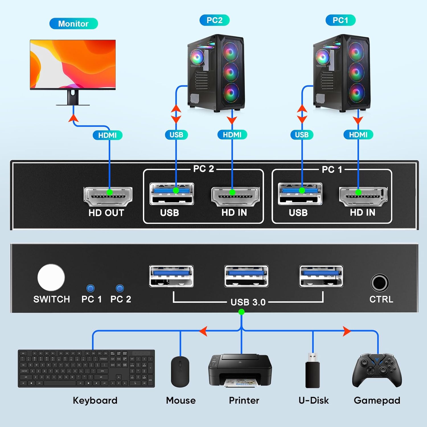 - 【KVM Switch HDMI 2 PC 1 Monitor】Die 8K KVM Switches 2 Port können 1 Set von Tastatur & Maus Kontrolle 2 PC teilen 1 Monitor. Kompatibel mit einer Vielzahl von Systemen wie Windows 7/8/10/Vista/xp, Linux, Mac, etc.