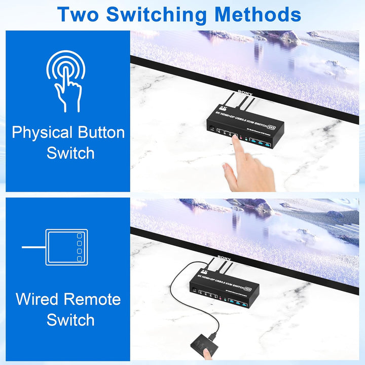 - Was Sie erhalten: 1x 8K@60Hz 4Ports USB 3.0 HDMI + 2 DisplayPort Triple Monitor KVM Switch, 4x USB 3.0 Kabel, 1x Netzadapter, 1x Wired Button Switch, 1x Benutzerhandbuch. Wir bieten 18 Monate Garantie. Wenn Sie irgendwelche Fragen zum Produkt haben,
