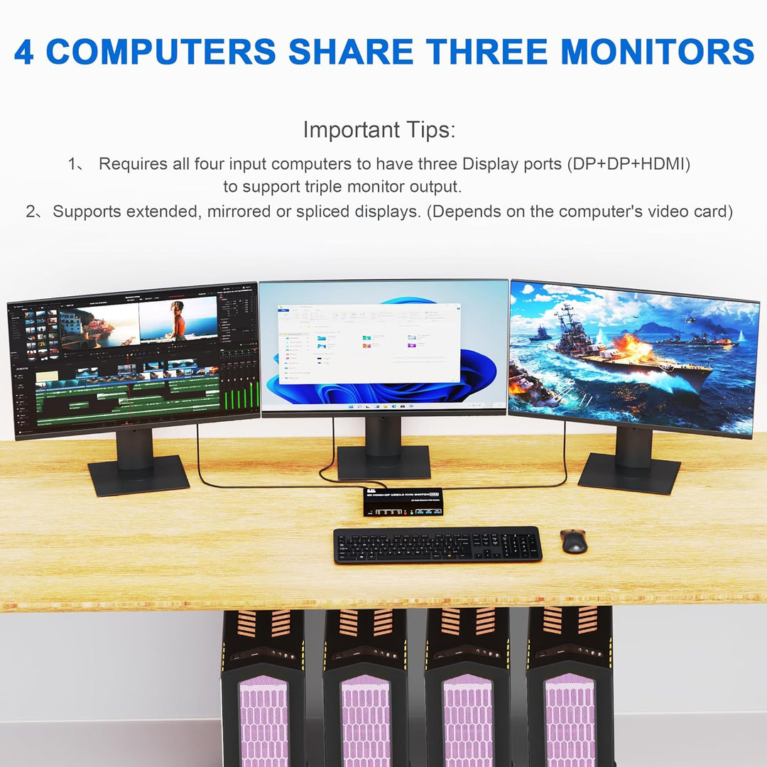 - HDMI+2 Displayport KVM SWITCH TRIPLE MONITOR Für 4Computer: Dieser KVM-Switch eignet sich perfekt für den Anschluss von 4 Desktops oder Laptops, um eine Tastatur, eine Maus und 3 Monitore für eine erweiterte, gespiegelte Anzeige gemeinsam zu nutzen.