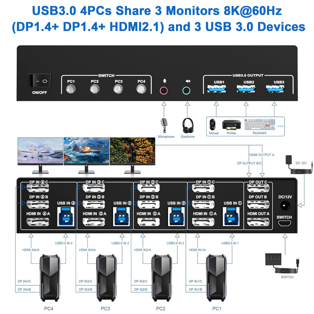 - 3 USB3.0 & Audio & Mikrofon-Ausgang: Dreifach-Monitor (1*HDMI + 2*DisplayPort) KVM-Umschalter mit 3 integrierten USB 3.0-Anschlüssen, die Tastatur, Maus, Drucker, Scanner und andere USB-Geräte erkennen können. Unterstützt ultraschnelle USB